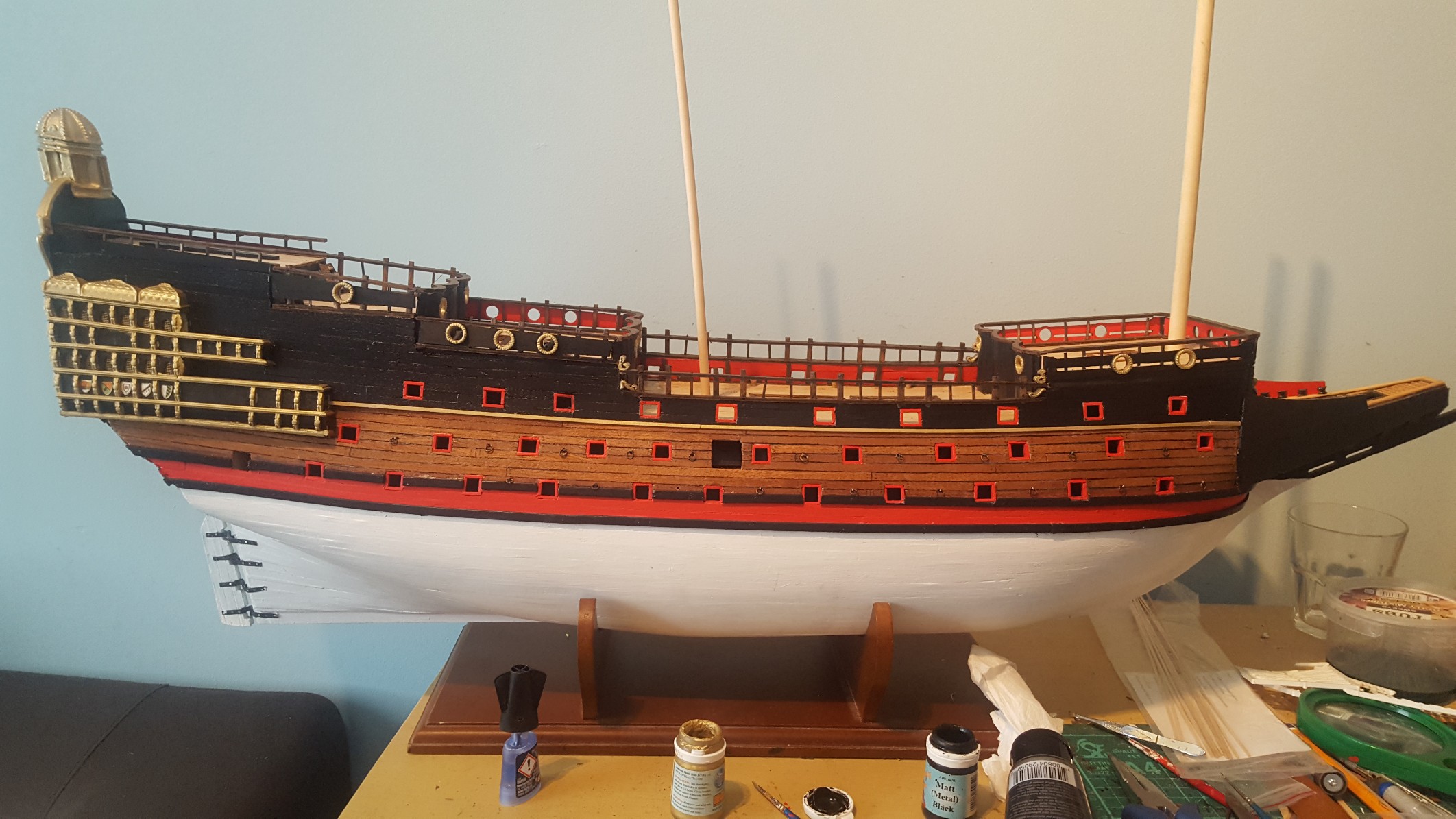 Today i have fitted the side port holes to the whales. My whales dont seem to be a perfect fit. There seems to be a small gap at the sides. In some pics i have seen though there are also gaps so i am going to leave it. I went for option one with the port holes and painted a ridge of black with the outside being gold