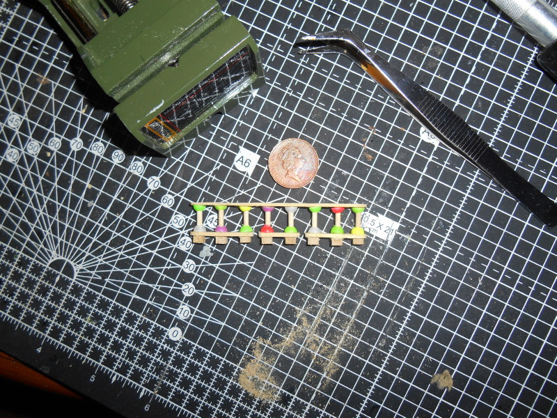 This weekend i have worked on the rails either side of the belfry, measuring and marking out on masking tape where you want everything to go first and sticking this into position, using 3mmX3mm mahogany square i used a round file to get the profile of the bases, then with a sharp knife cut from the bottom of the semi circle lengthways with the grain of the wood down to 1.5mm and then cut the whole thing to length, these were then painted before being glued to the deck,next was attaching the rail, this is 1.5mmX5mm strake off cut,the caps were made from 3mmX3mm mahogany sq, the tops of the caps were filed down with a slight angle with a flat file and then the bases were cut square, next to the belfry the rounds (?) are 4mm dowel drilled out and cut in half and mounted on a small base, this needs to be filled and cleaned up, the belfry is not stuck down as yet as this needs to be primed and painted
