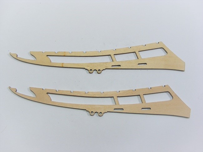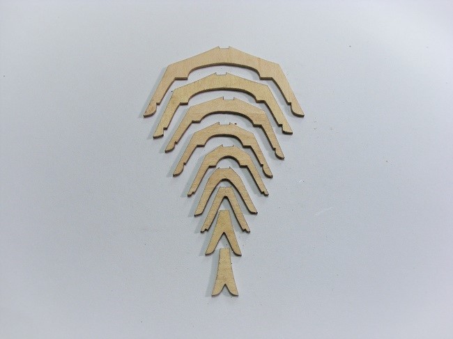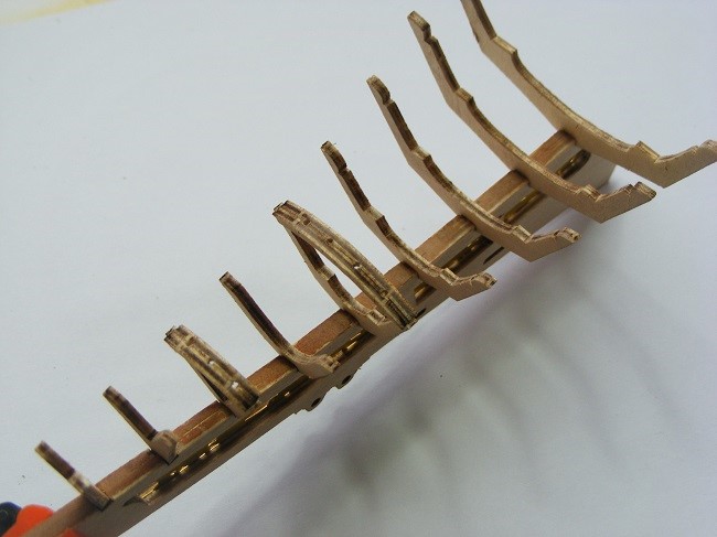 Separate the frames BS2-BS10 from the fret and sand all edges smooth. Tests fit and glue the frames BS2 into the first aft notch of the stem. The frame should be positioned at a right angle to the stem. Now test fit and glue the remaining frames to the notches in the stem, making sure each frame is at right angles to the stem.