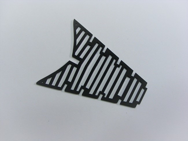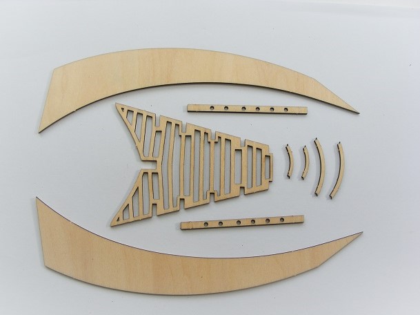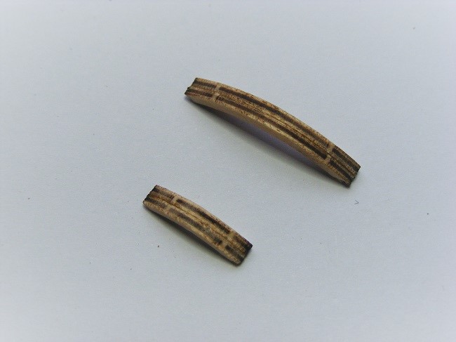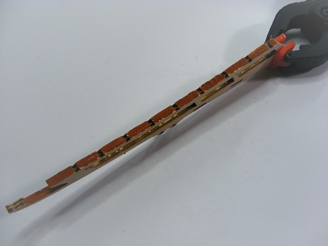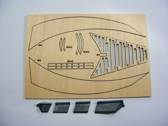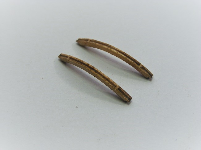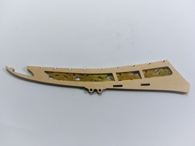 Remove the two stem halves BS1, the decoration BSA from their frets and smooth all edges to remove any ash and burrs. Glue the decoration BSA between the two stem halves BS1 ensuring the upper edges of the three parts are all aligned. Now apply some wood putty along the edges of the stem to fill the joins between the pieces, keeping the notches clear. When dry, sand the edges smooth. Note: As I’m using wood stain, I chose to use dark coloured wood putty.
