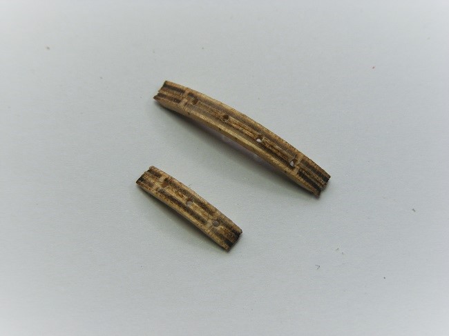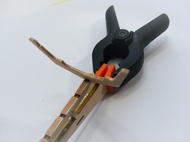 Remove parts BS11, BS12, BS13, BS14 and BS15 from the fret then smooth the edges. Glue the two rails BS12 together, making sure the edges are aligned. Then dry sand the edges of the combined pieces. Now drill four 1mm holes along the centre of the rail, the holes should be 6mm apart. Now glue the two rails BS13 together, aligning the edges. Sand smooth then drill three 1mm holes, 5mm apart (not 6mm as stated in the instructions). Glue the assembled parts BS12 and BS13 onto the tops of the stem frames BS6 and BS8.