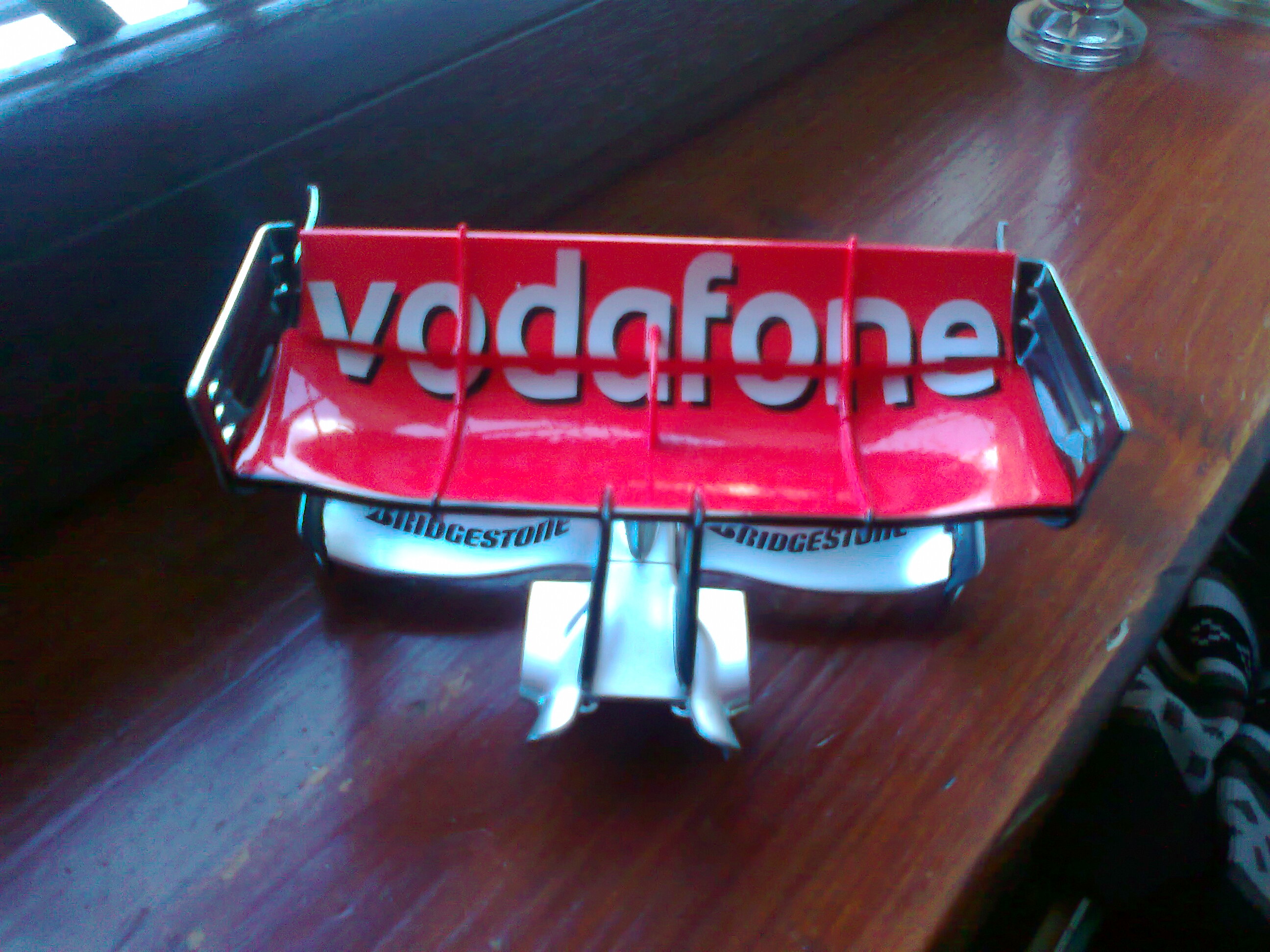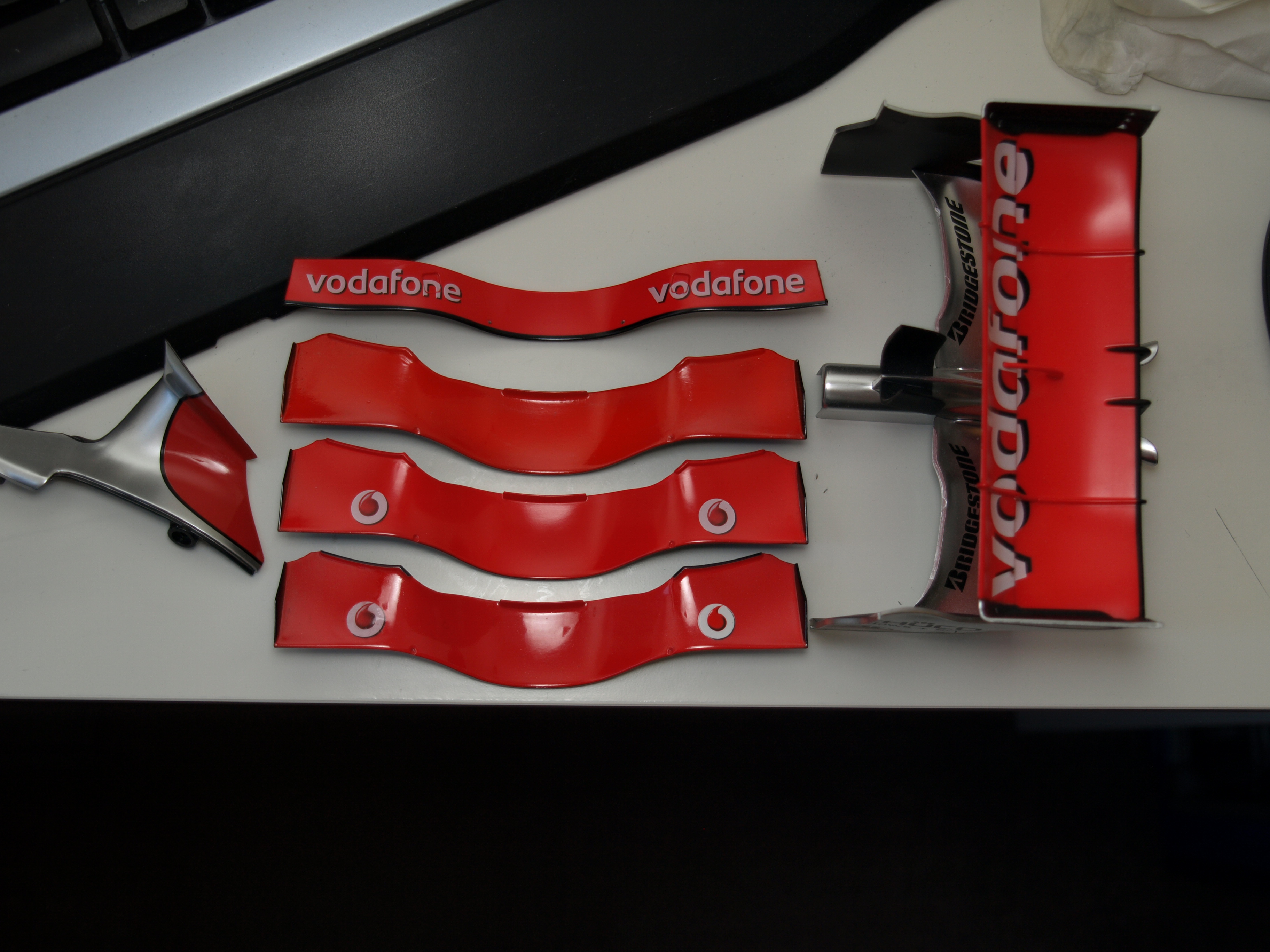 Ok... here is a picture of the front wings with different types of finishes.. The top one with the Voda logo's has been done with "Klear" (formaly Johnsons but now by "Pledge") This has about 10 coats to achieve the finish.. The Second one down is the wing painted with "Zero paints MP4 Red" with a coat of Halfords Clear coat.. Next is the "Original" part with 10 coats of "Klear" And last is the "Original" with a coat of Halfords Clear.... Beside is the rear wing "Untreated" to give a comparison along side the Pods... I could give you my thouths on those but if I do then... well thats a different ball game I will attempt to put up a small video on utubebookface thingy showing how to do the "Klear"... It really is simple as "Bigmal" will tell you.. He is the "God" when it comes to this stuff lol Spencer PS I'll attache the original size so you can download it and see better.. File Attachment(s): Warthog attached the following image(s):