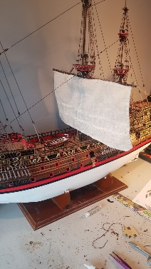 Ok lads I have been very busy the last few weeks with this. I now have all the rigging stays done etc. Very fiddly making sure all the masts are straight etc but I am pleased with the outcome. I have the main sail rigged and hung. I havent decided yet but i think I will be rolling up the bottom sails like on some models i have seen here.