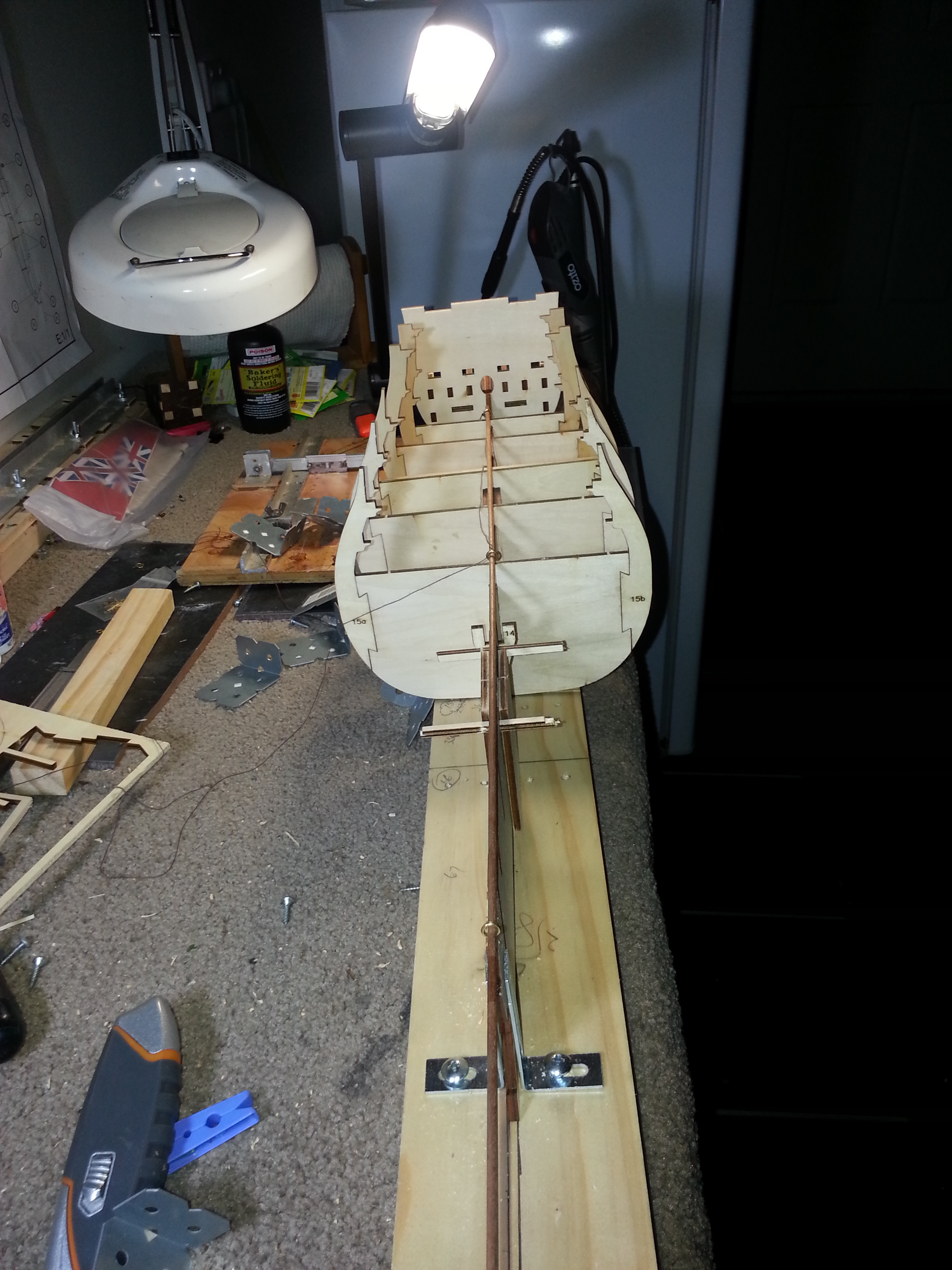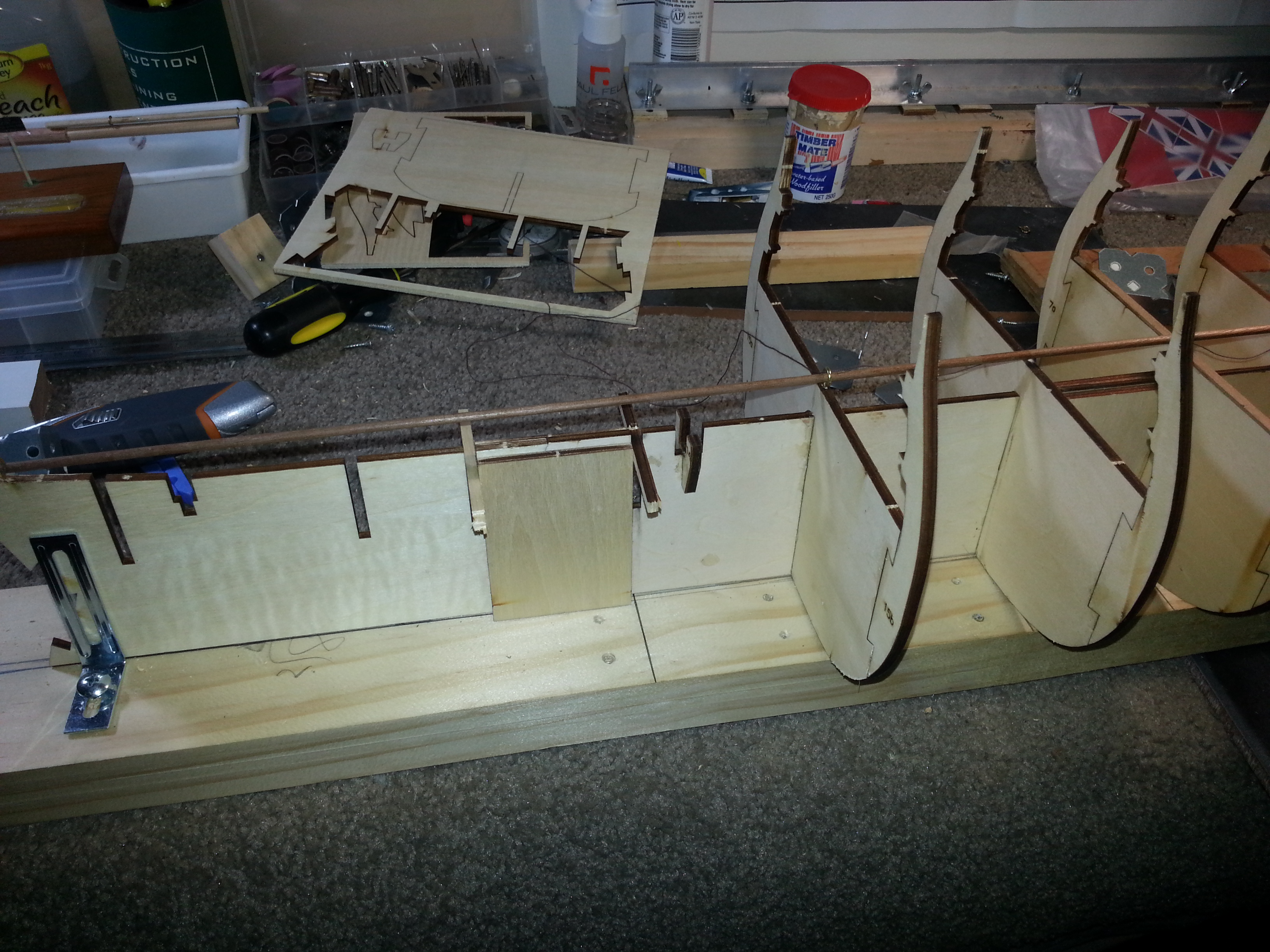 I have also considered using the brackets by securing the smaller facing to the either side of false keel for each bulkhead and the long face squares the bulkhead and then bolting the bulkhead to fix the position which I may still do.