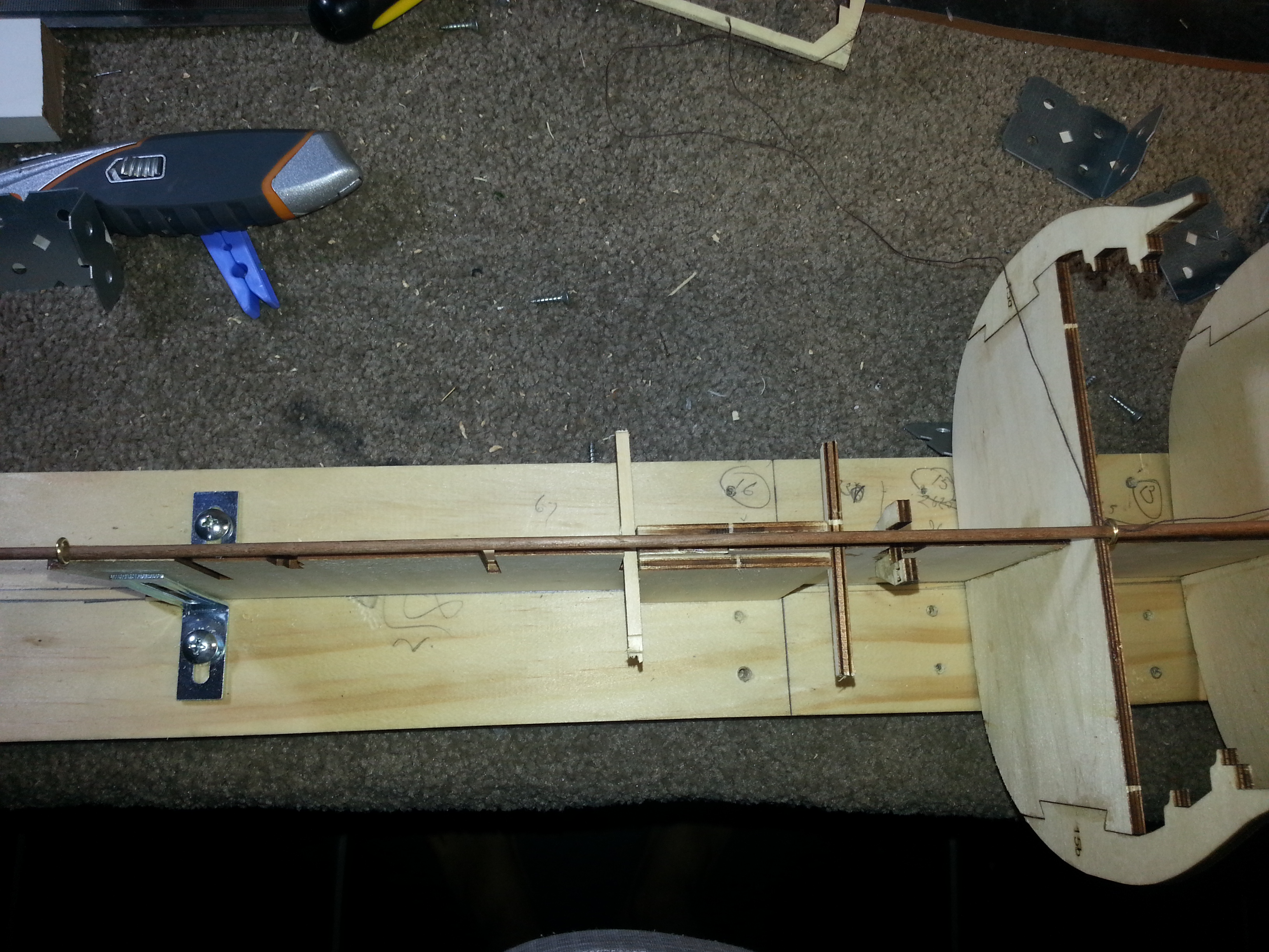 Thanks you for your kind words George but I am mechanical challenged! The brackets are 25 x 50 x 40mm galvanized "Make-a-bracket' bracket and very close to 90 degrees. Haven't needed to bend or shape but used set squares to make sure all is ok. Taking up your idea of hanging back on the assembly prompted me to check the alignment of the keel. I rang a string line along the topside and thought this wasn't working so I decided to use some fine screw type eyelets setting 3 up the centre and then running a piece of dowel down the middle. This gave me a quick visual check to ensure everything was in line and then adjust the brackets accordingly. Also used some left over sprue to act as a spacer when fitting the two joining pieces. Now all I need do is wait until next Thursday.