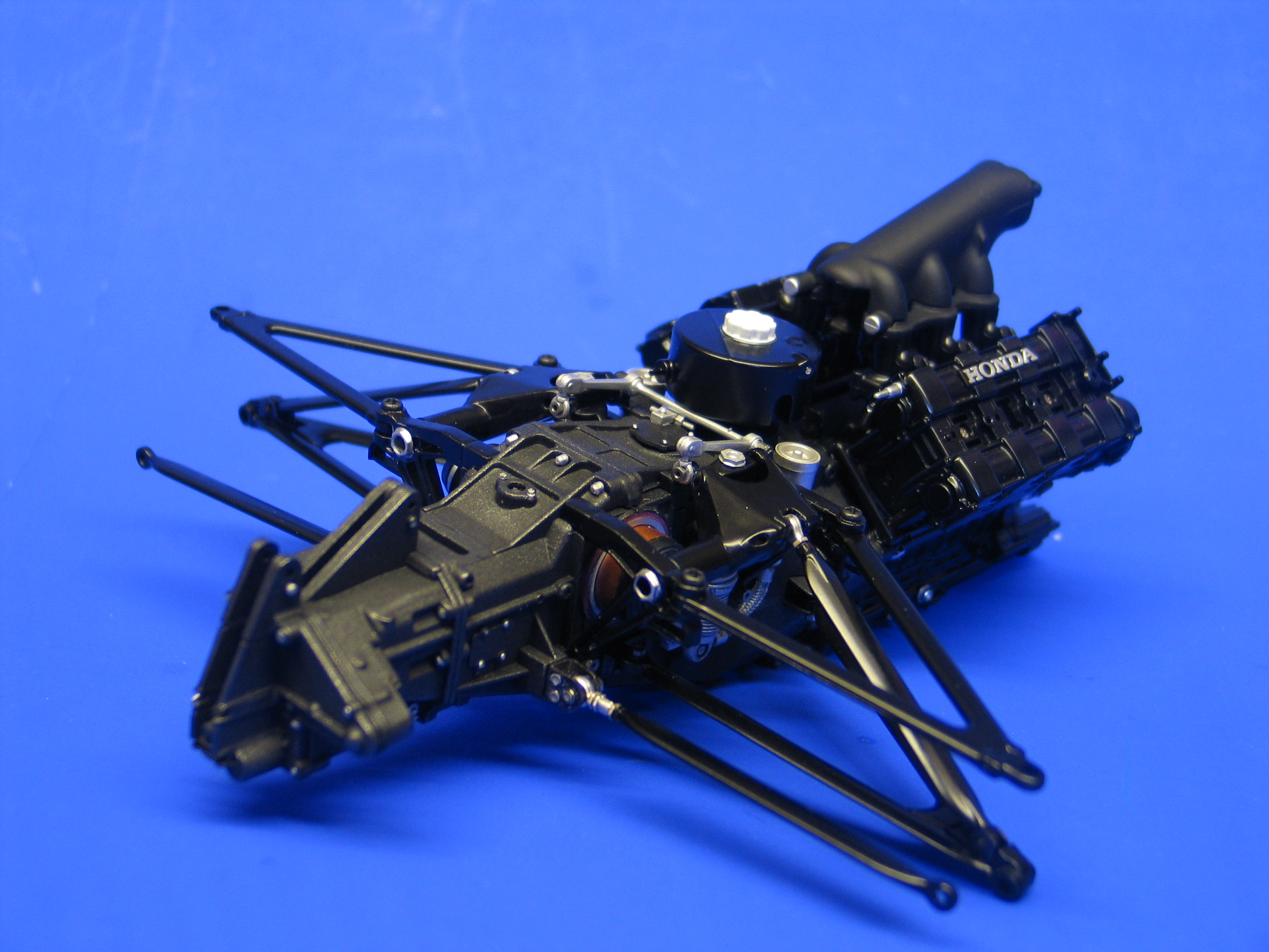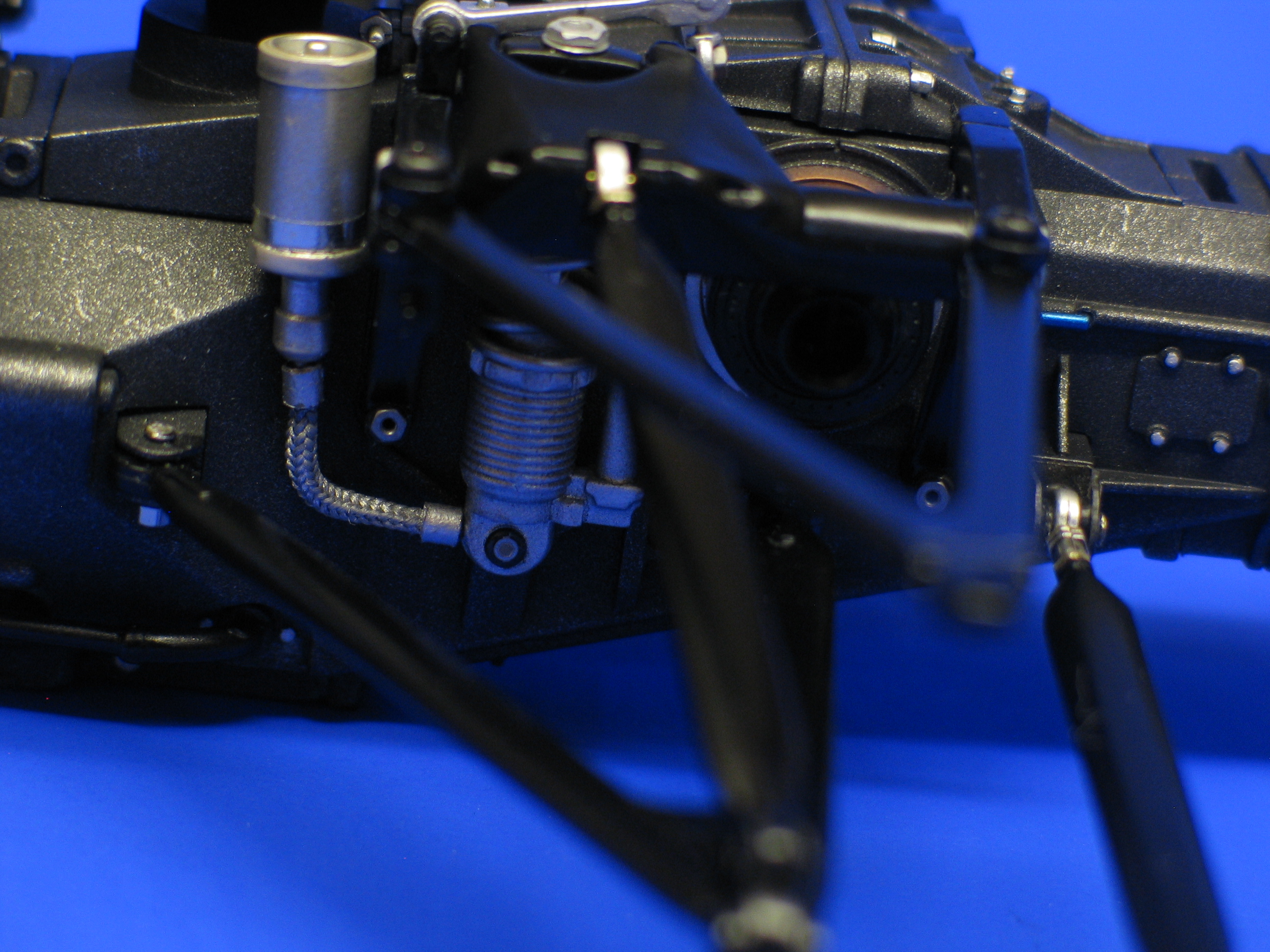 To kick off, I posted a few pics of the gearbox a couple of weeks ago - this was painted over the bare plastic with a metallic mix. I've now got rid of most of the pesky screw heads and painted/added in a few nuts here and there - particularly over the damper top mounting, which should have a huge hex nut and an inner fixing nut - but NOT a chrome cross head screw!! - and all the suspension fixings. I havent done the top inner wishbones yet, as there is a cross-brace between the front fixing and the engine which is not supplied, and I have to work out how to make these yet.