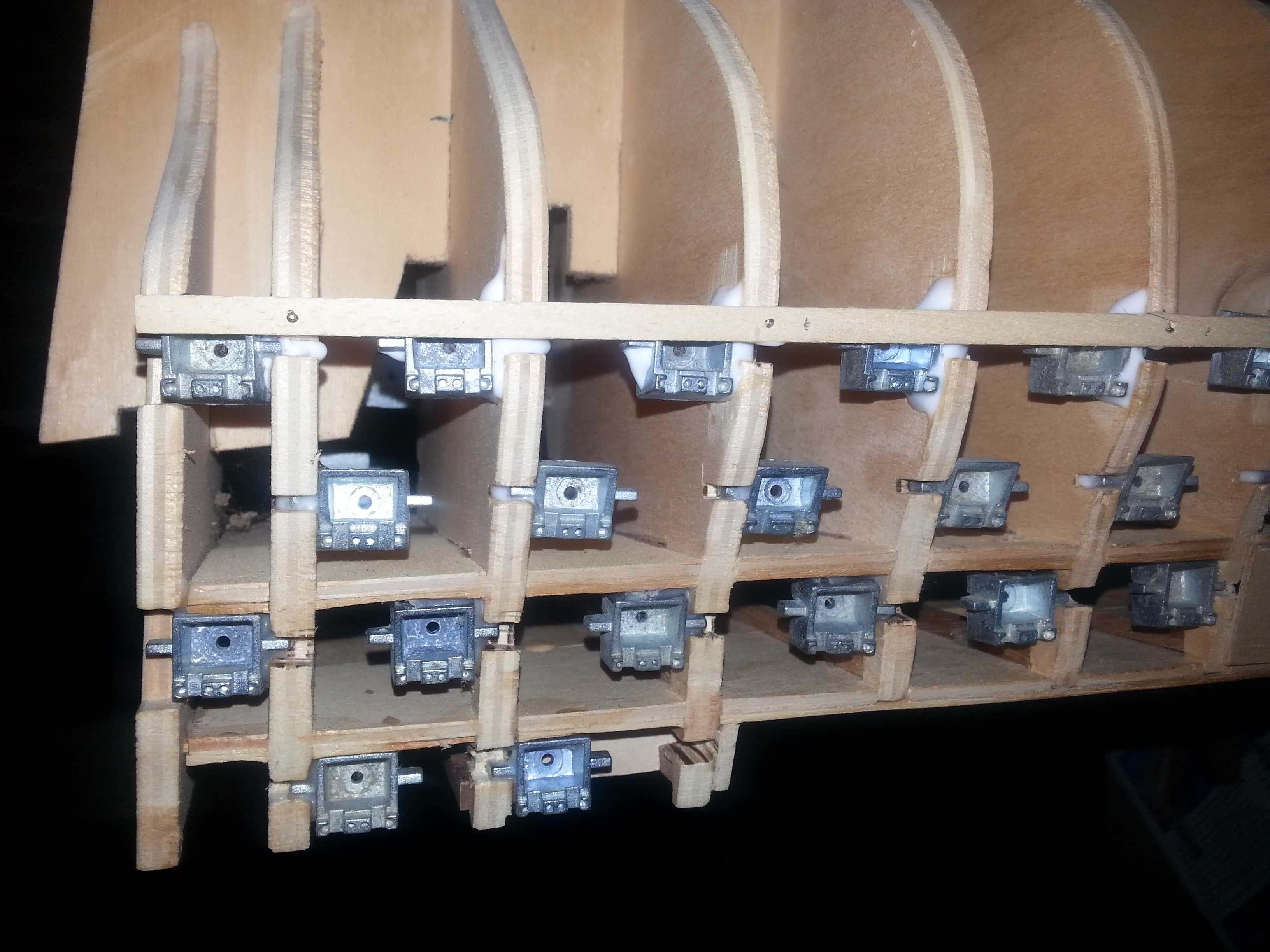 OK, hopefully this comes out as a picture instead of a file, some of the gunports supplied were a funny shape, narrow at the front and wider at the back so i had to pack it out a little bit with a cocktail stick until the glue dried, the instructions were a bit hazy on this, ie: glue them into the slots, after they came out twice igot the dremmel out and had to re-cut the slots make them deeper and change the angle of some but finally got there.