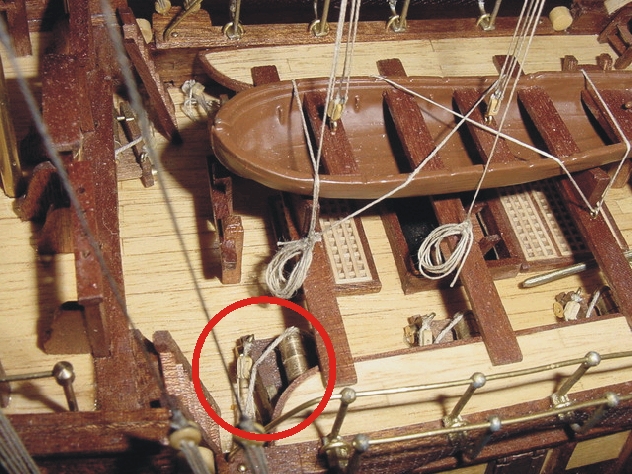 The other tackle is for running out the guns after they have been reloaded. Notice how the long end of the rope has been neatly flaked down into a coil.