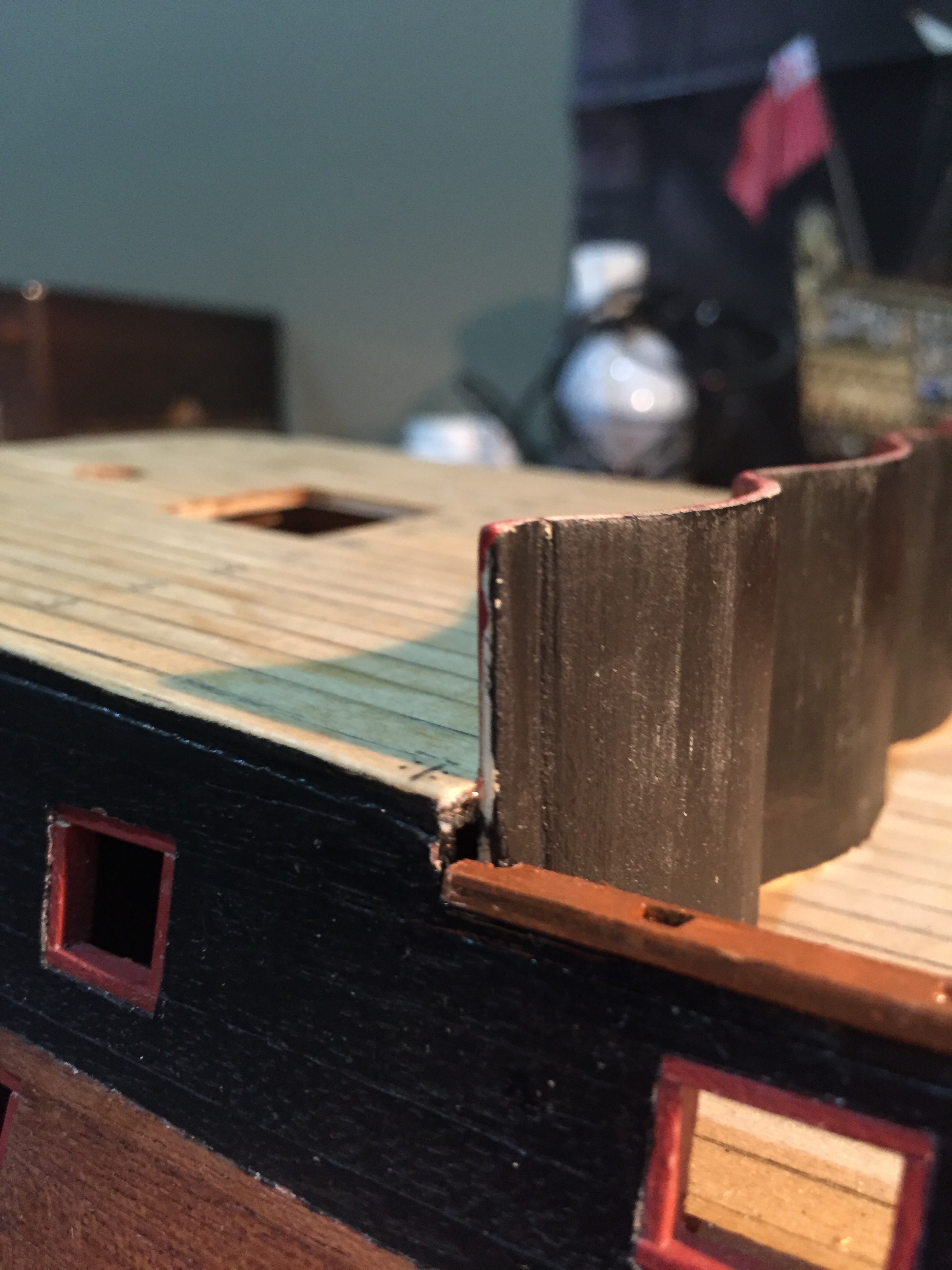 Not sure if I have a problem here but instructions and images are not that clear. In step 14 of the hand rail assembly it says that the top rail should 'abut the quarterdeck and forecastle'. These decks are at different heights above the central bulwarks. This means that bow end of the top handrail will be around 6mm higher than the forecastle deck. Is this correct? I will try and attach images to show you what I mean.