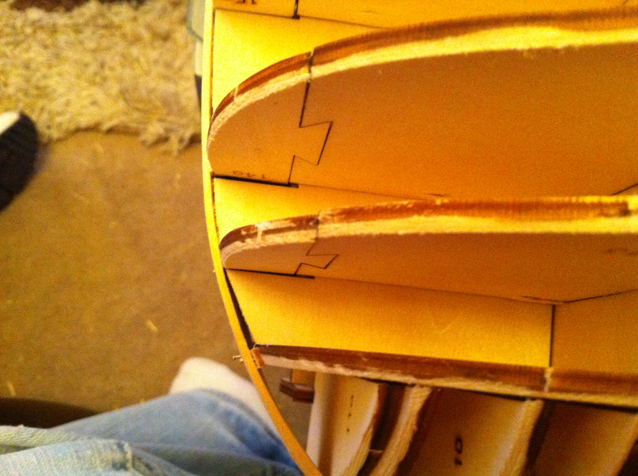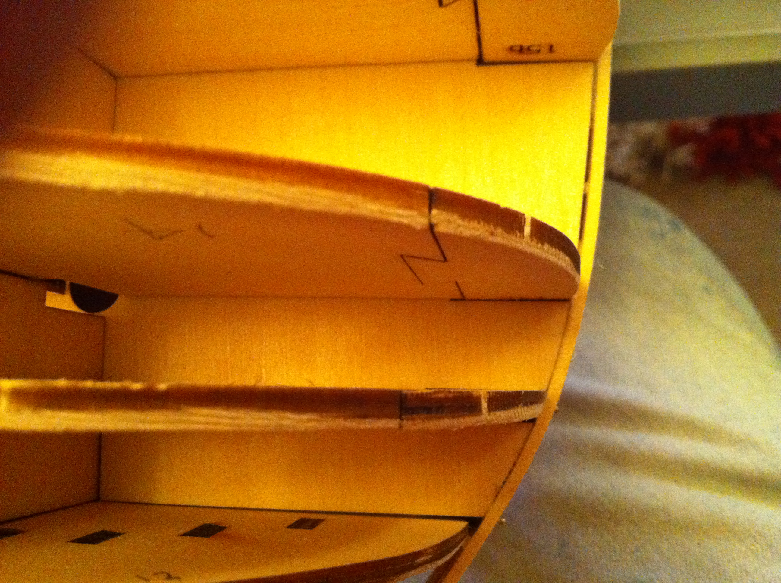 I think I found the problem Alan going over the bow there is a small gap between rib 13&14 near the second deck on the left side not so much on the right I might be wrong let me know