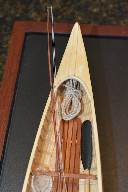 I used a spray can of satin polyurethane for the finish and used it at each stage. When the hull was finished, remove the mold and very carefully sand the interior. Spray. Bent and add the ribs to the interior with CA. Spray. Shape the back rests and attach. Spray. Add combings and caps and spray. Material for the two paddles was provided. Make them and spray. Build and install the flooring pieces and spray.