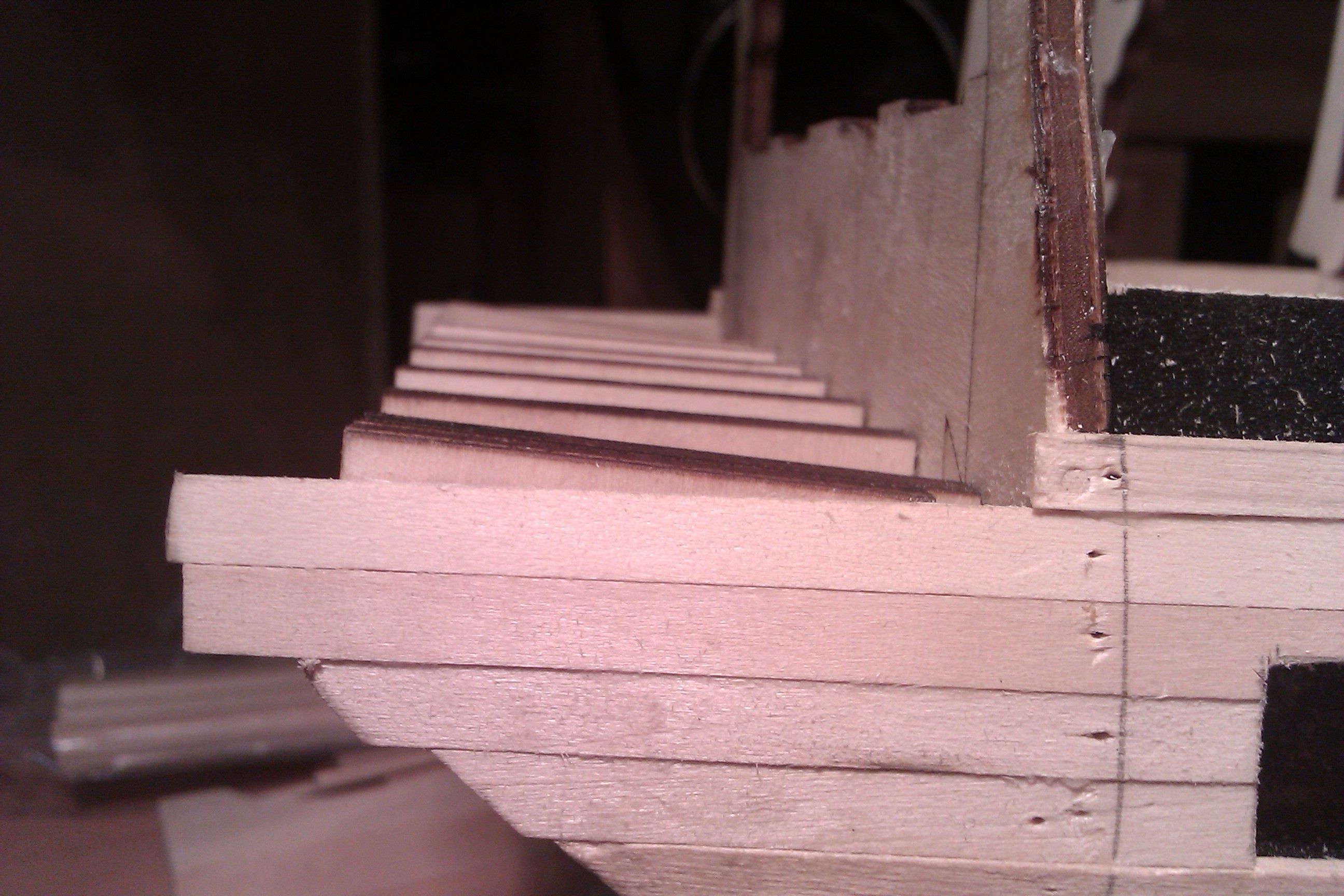 I agree with Bob, by the time you've sanded to take care of the downward curve of the gallery base there will not be much of a gap, but to be on the safe side it would'nt hurt to build the planking up a bit, there won't be any of this visible when the gallery is built!