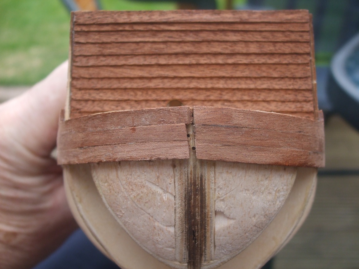 Hi Saintsman, I started fitting the first planks (3 each side) following the shape of the bulwarks. I liked the look of it but I could see that I could have problems further down the hull. So I unglued about a third of the length of planks from the stern and leveled them off. I'll put some pictures up at the weekend when I get some time. cheers Peter completed..... Endeavour Longboat, San Francisco 2, Virginia 1819