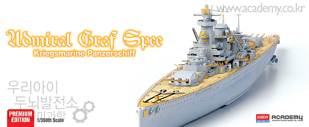 Latest Academy plastic kit ship release - 1/350 Premium Edition kit of the Admiral Graf Spee, which includes wood decking, brass gun barrels and photo-etched brass detail parts.
