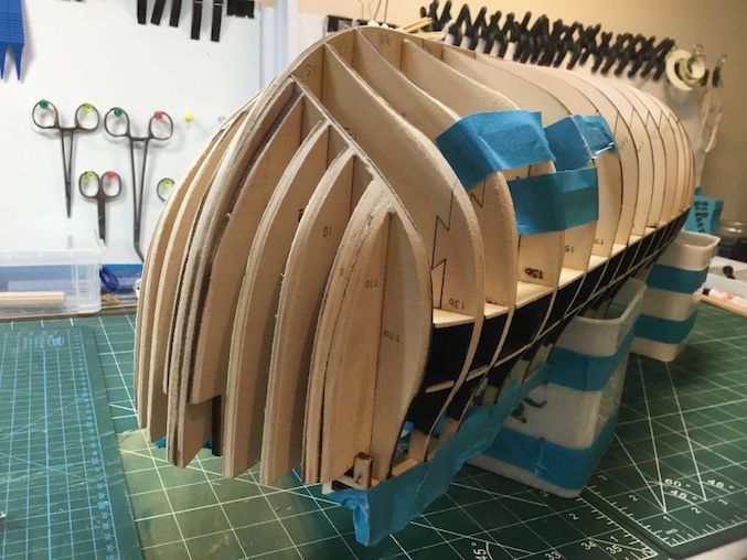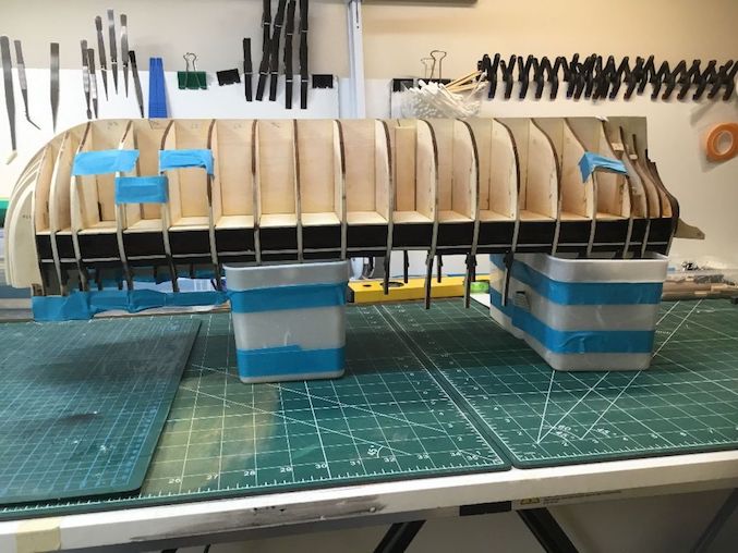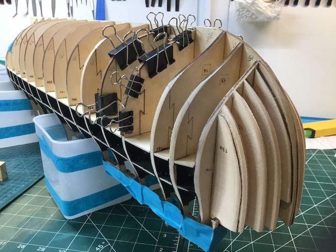 Started the fairing of the hull and attached a few pics of progress. I've only really worked my way around the bows, concentrating on the areas at decks level. I've used some old plastic storage pots to support the hull upside down rather than stand on the legs of the bulkheads which are a bit flimsy. I have also been adding strips of wood to the edges of frames 15 and 16 to build them up a bit. More strips still to be added particularly near the keel section.