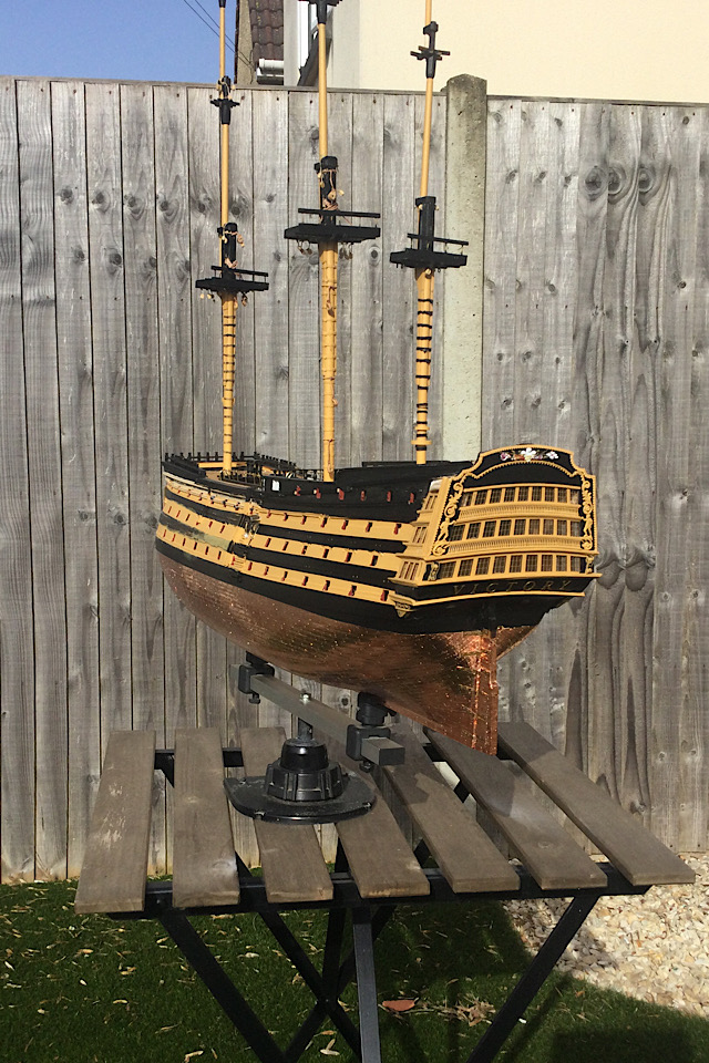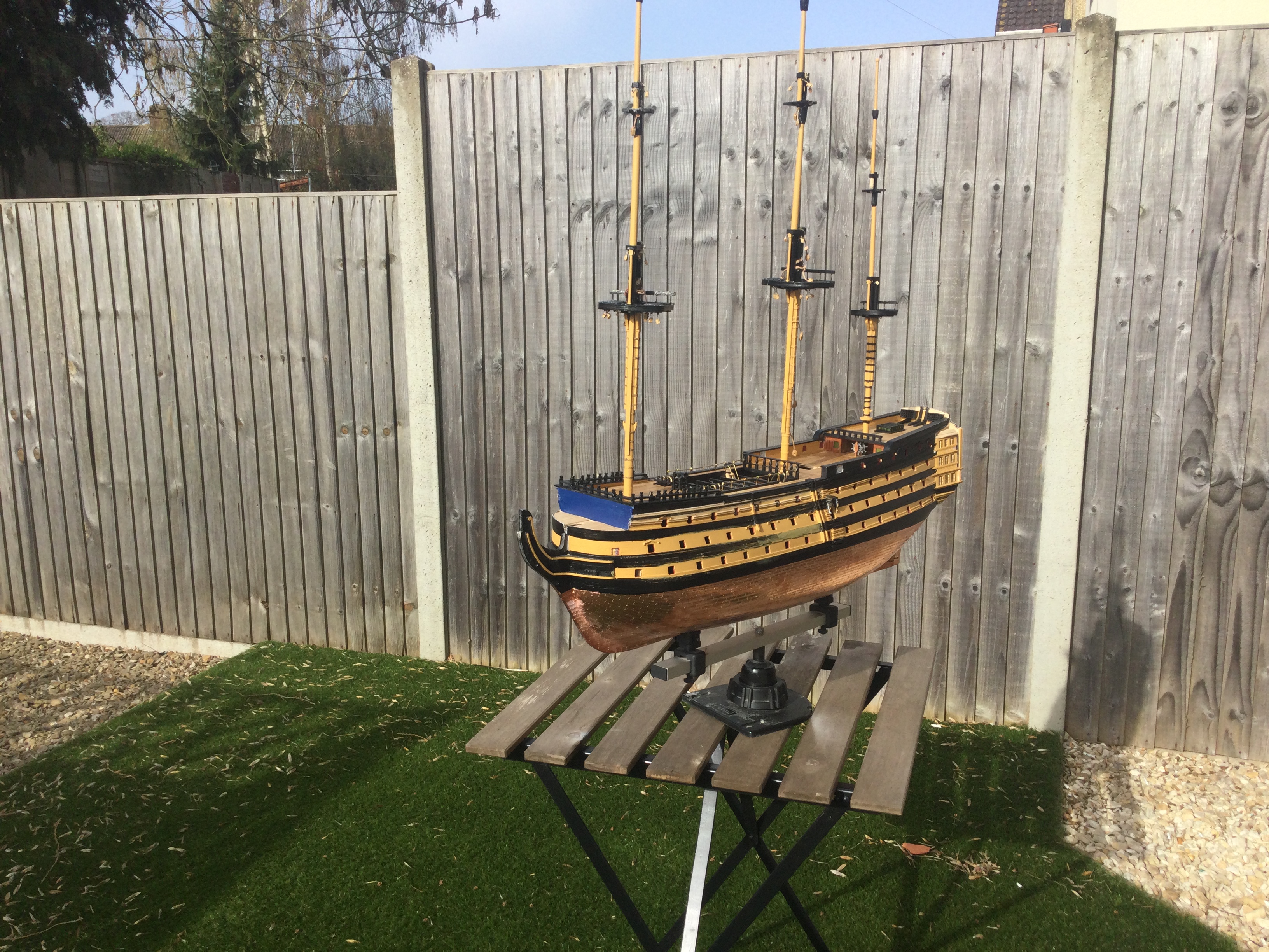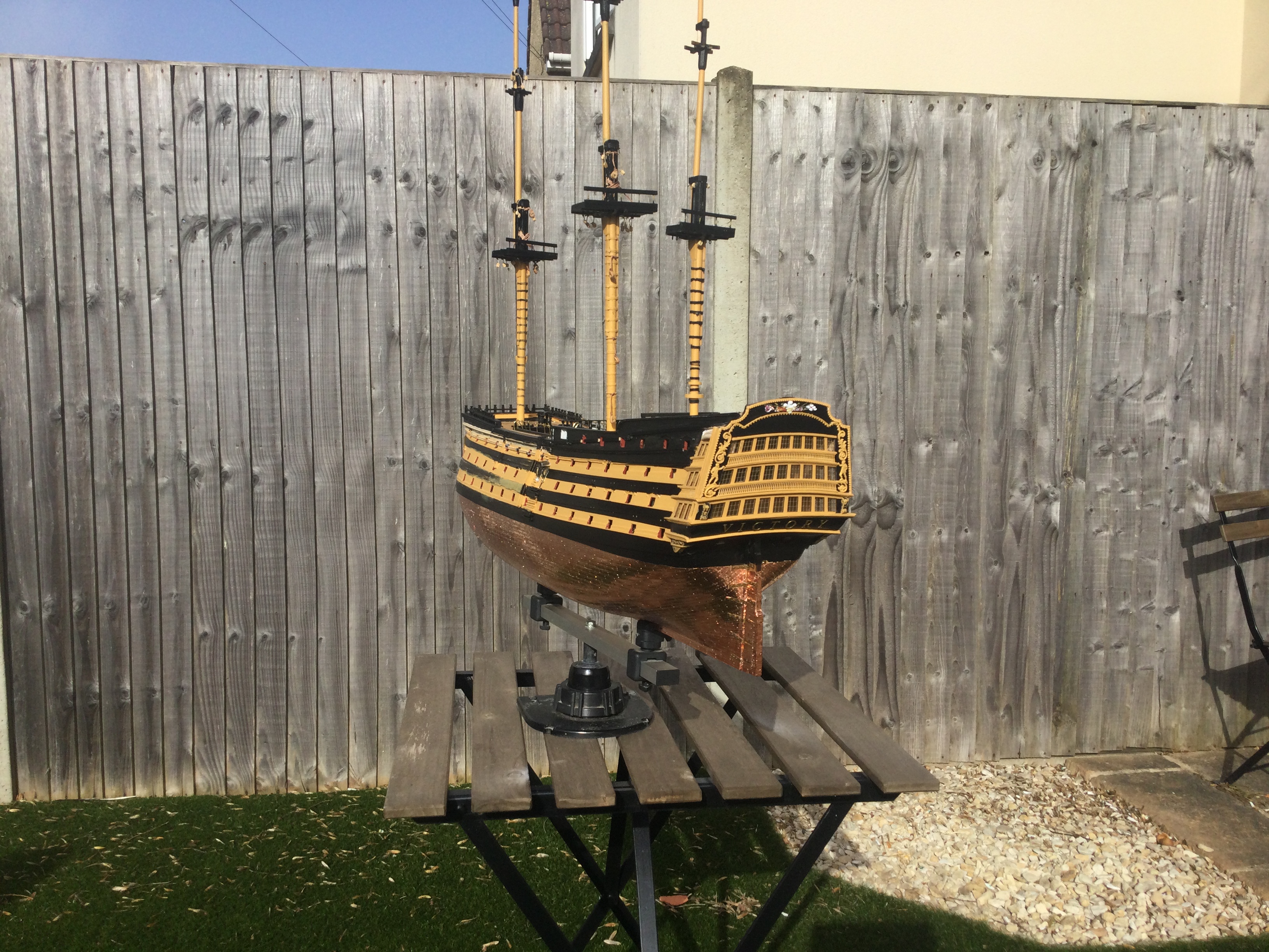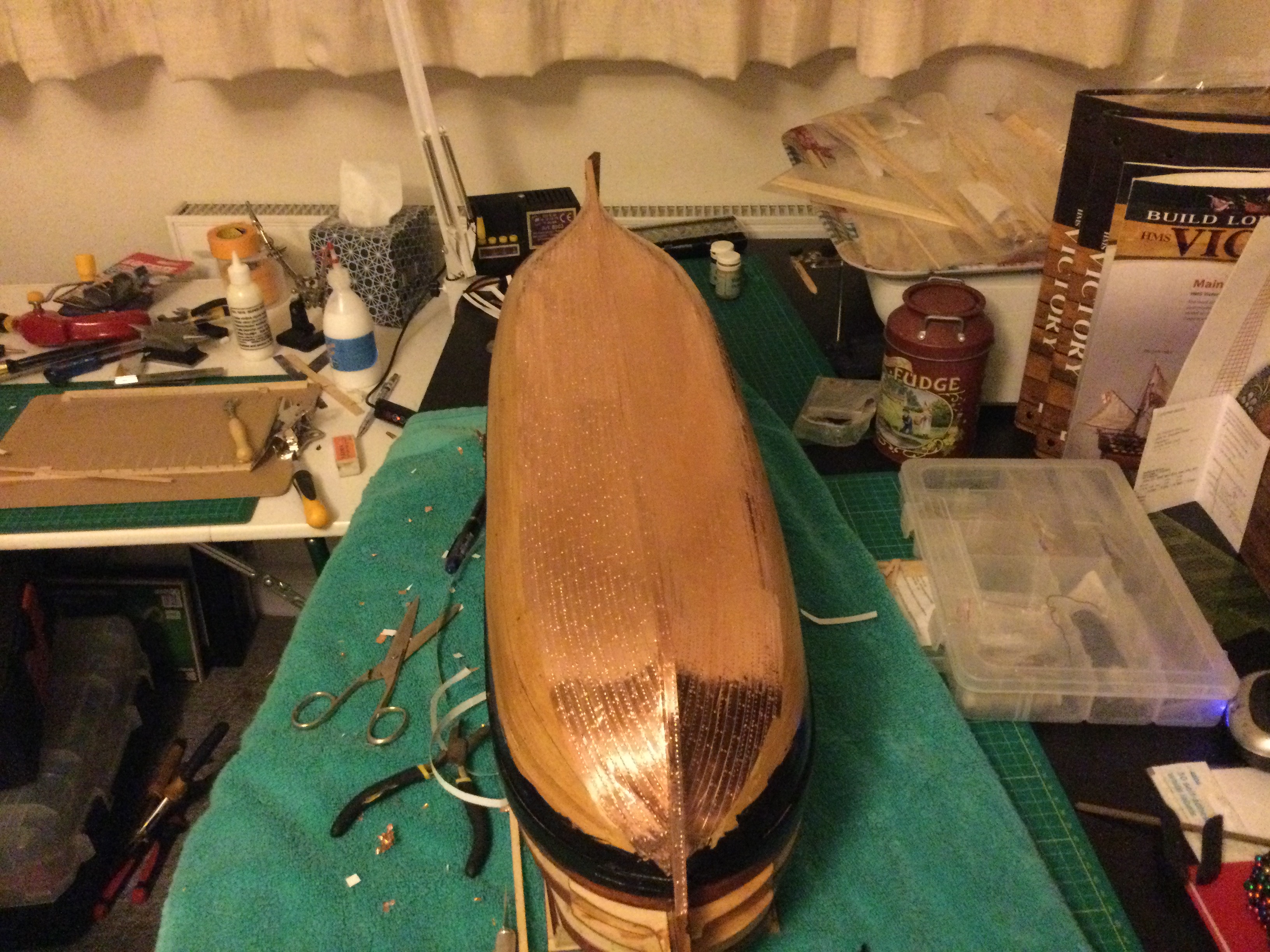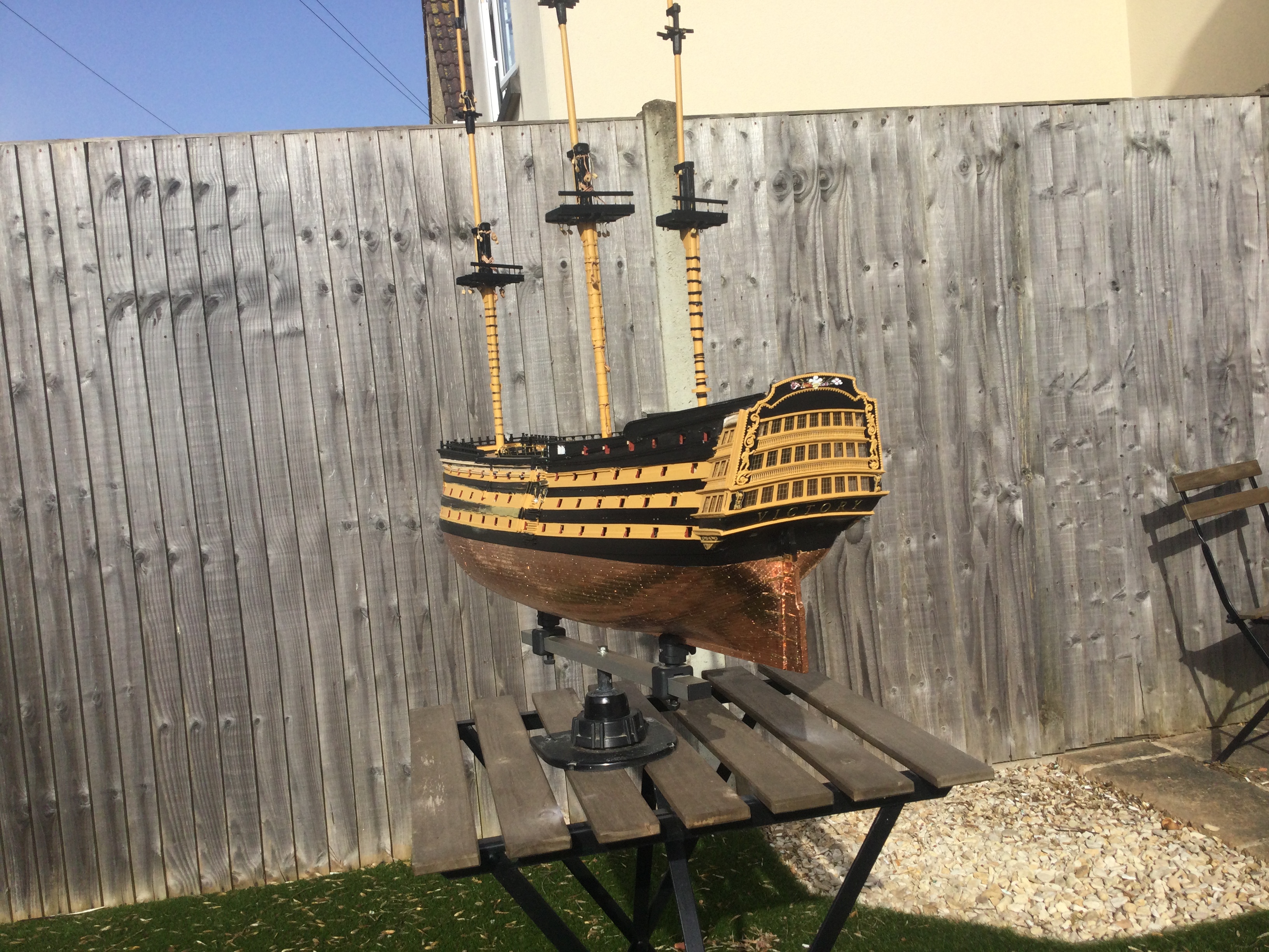 HI just thought I would say hi and post a few pics of my build, it has been a while I started in 2010 and put a couple of years of evenings and weekends into her and got as far as issue 72 and there she sat as life events got in the way, anyhow I have been on furlough for last 10 weeks so decided to dust her off and start again, I had to create a new space and get a workbench dig out all the tools work out where I was, that itself took a weekend up. So here I am several weeks and a few hundred hours of work later and I have turned her from her stained look I was originally going to just do the stained version, to her new painted look with the copper hull using the copper tape method.