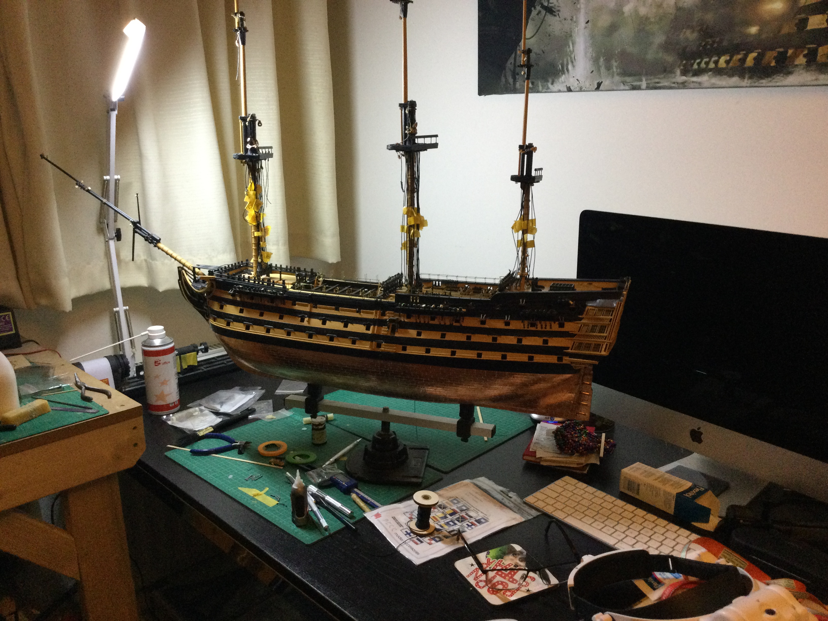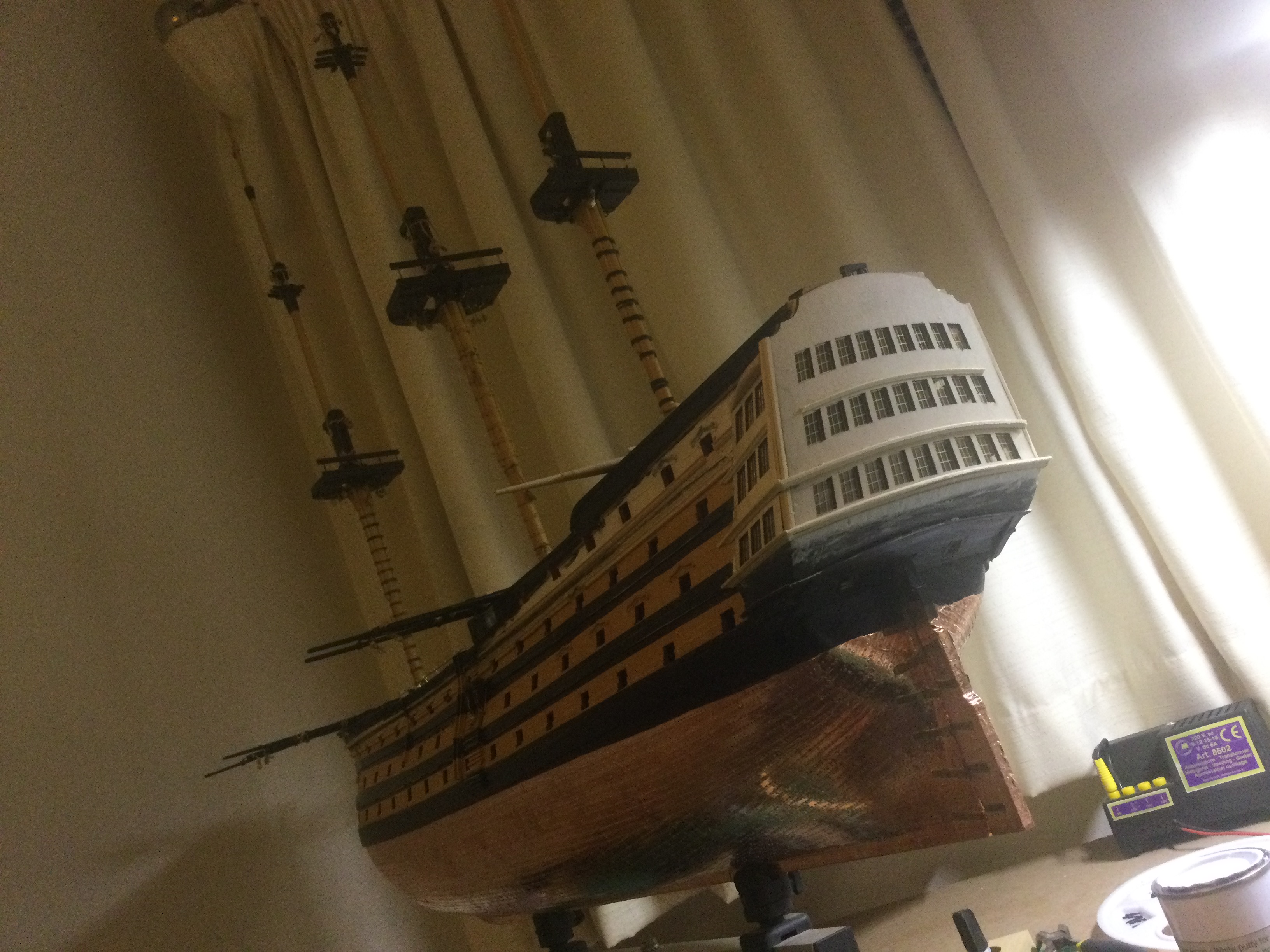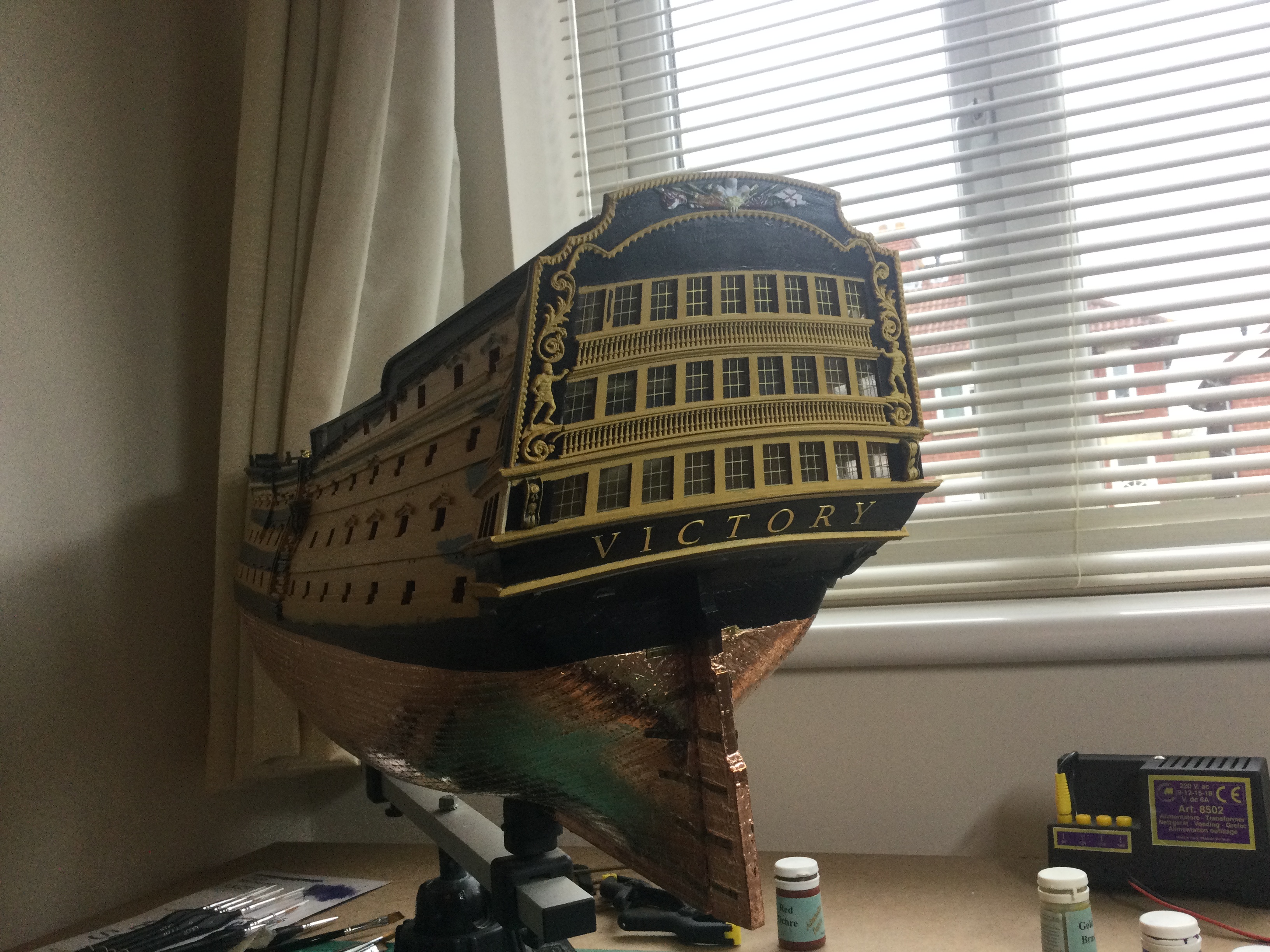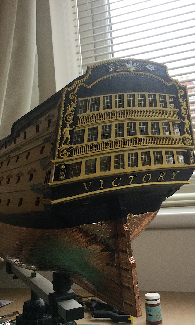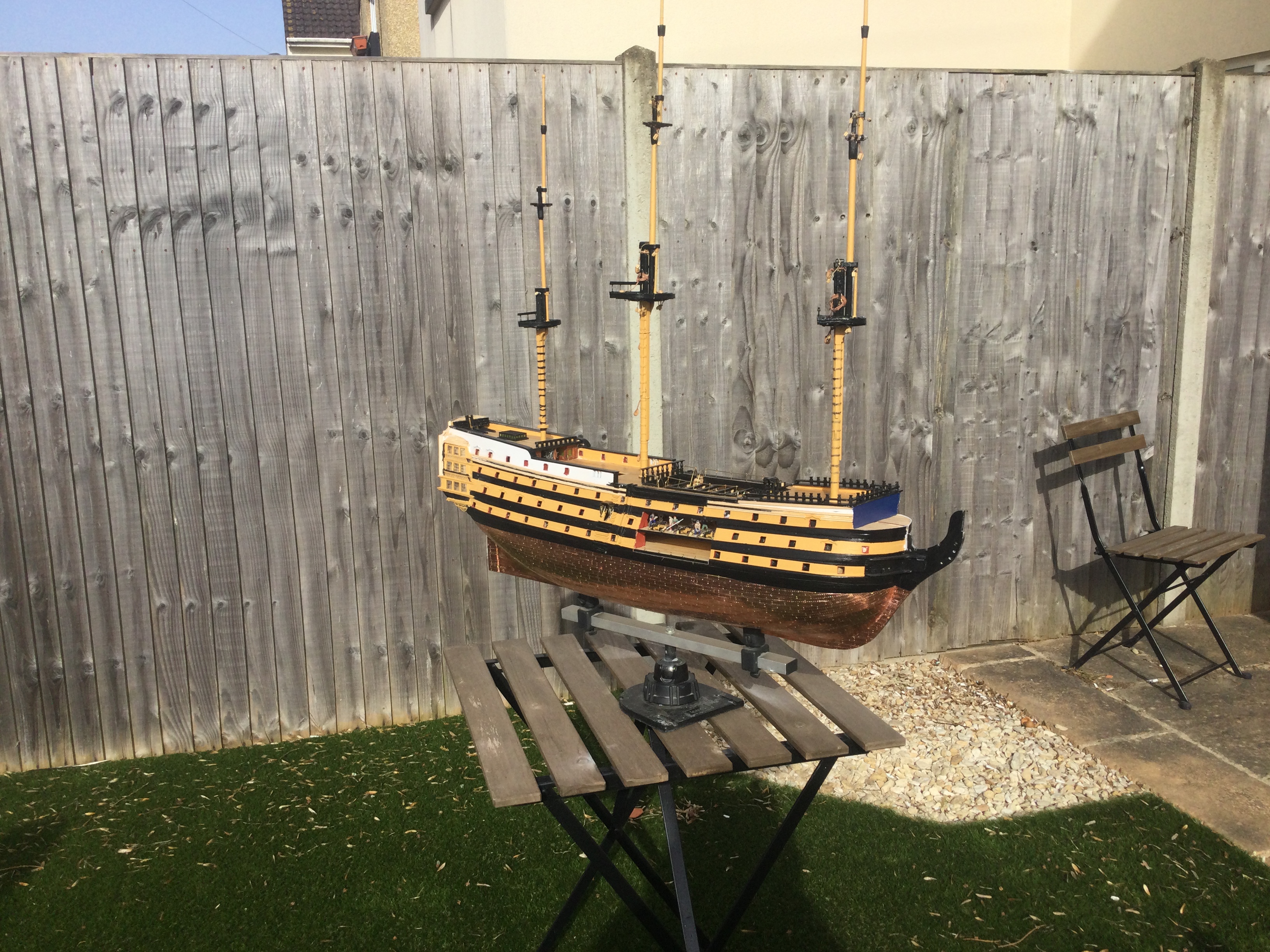 HI just thought I would say hi and post a few pics of my build, it has been a while I started in 2010 and put a couple of years of evenings and weekends into her and got as far as issue 72 and there she sat as life events got in the way, anyhow I have been on furlough for last 10 weeks so decided to dust her off and start again, I had to create a new space and get a workbench dig out all the tools work out where I was, that itself took a weekend up. So here I am several weeks and a few hundred hours of work later and I have turned her from her stained look I was originally going to just do the stained version, to her new painted look with the copper hull using the copper tape method.