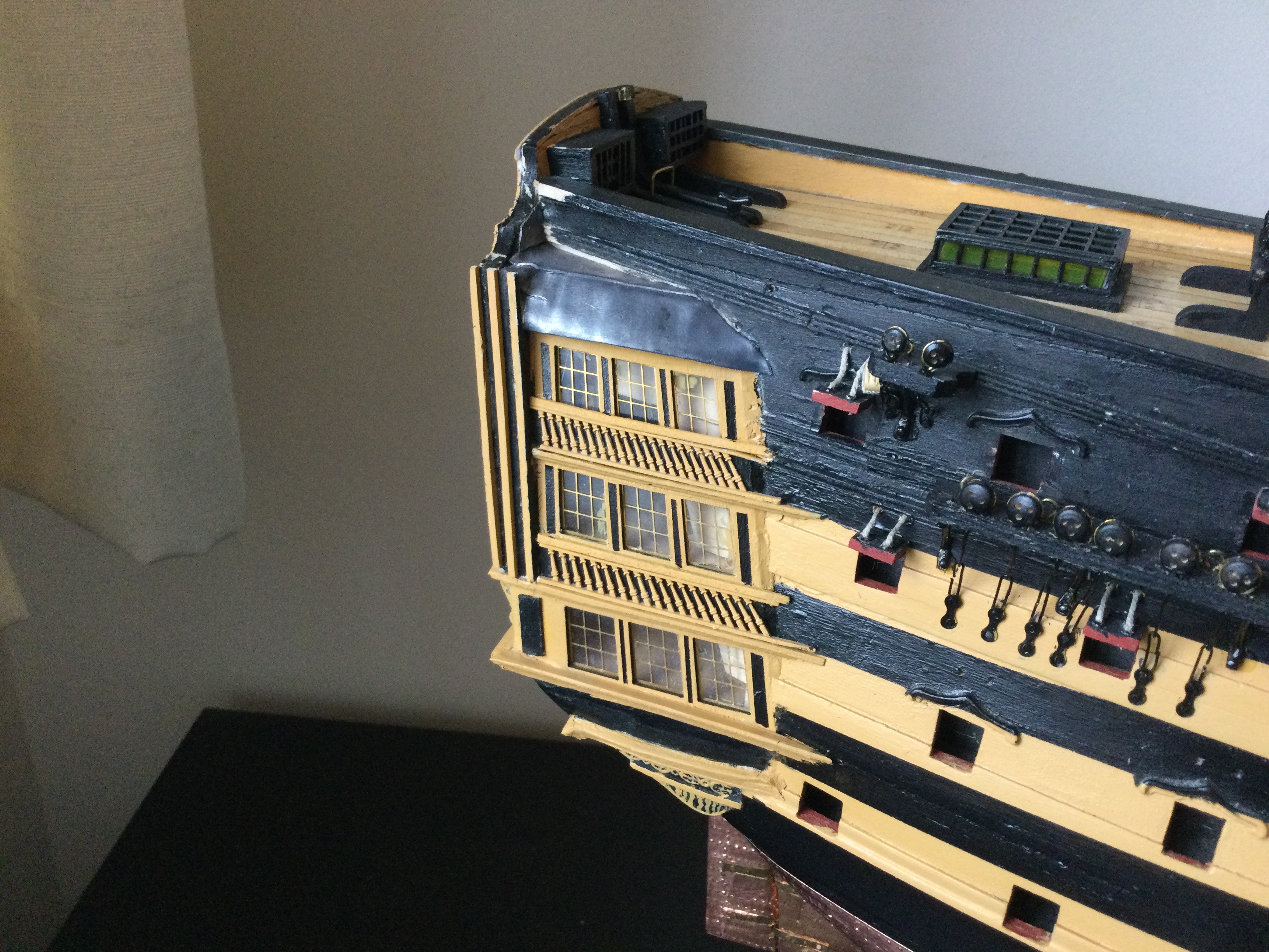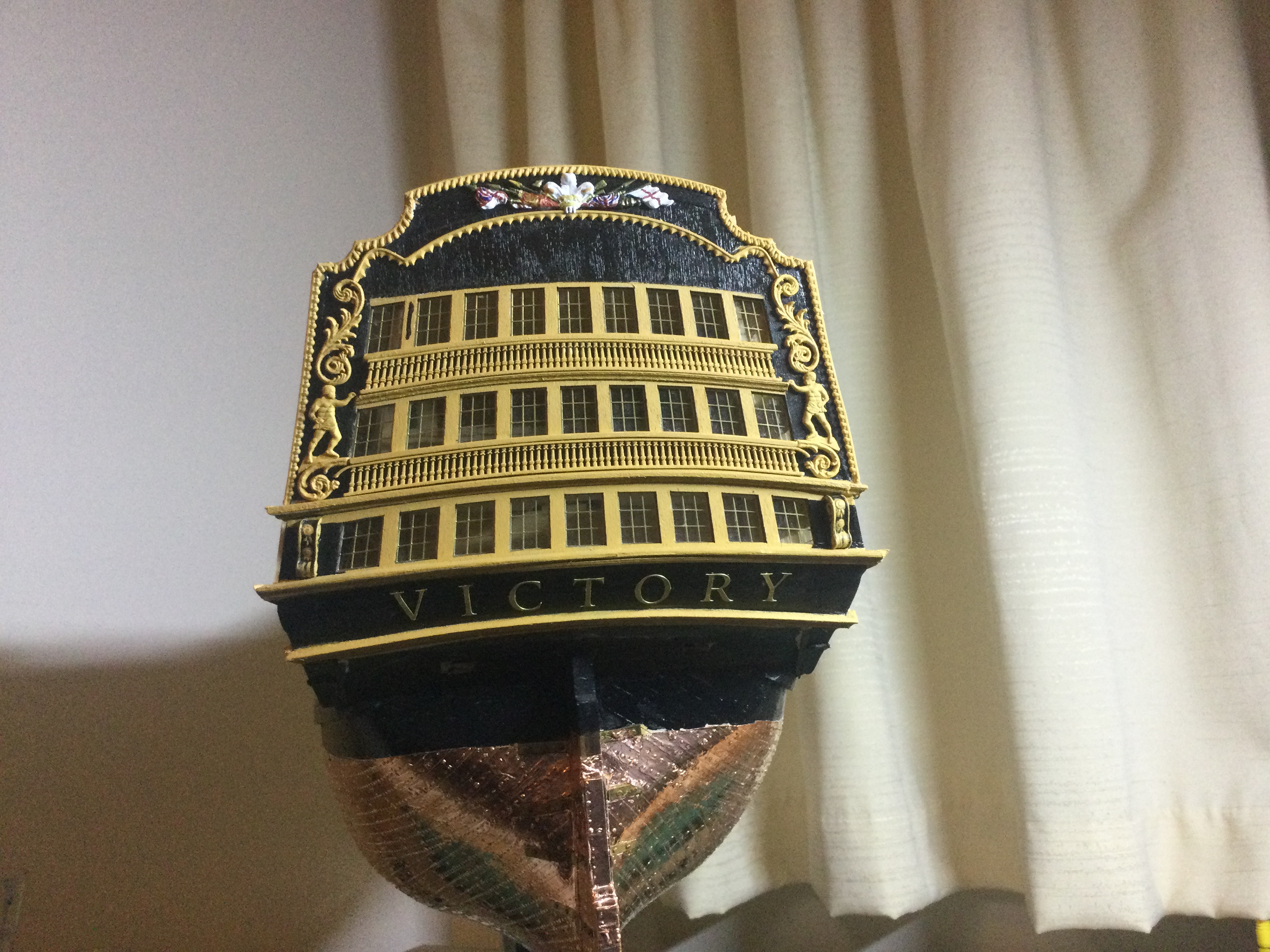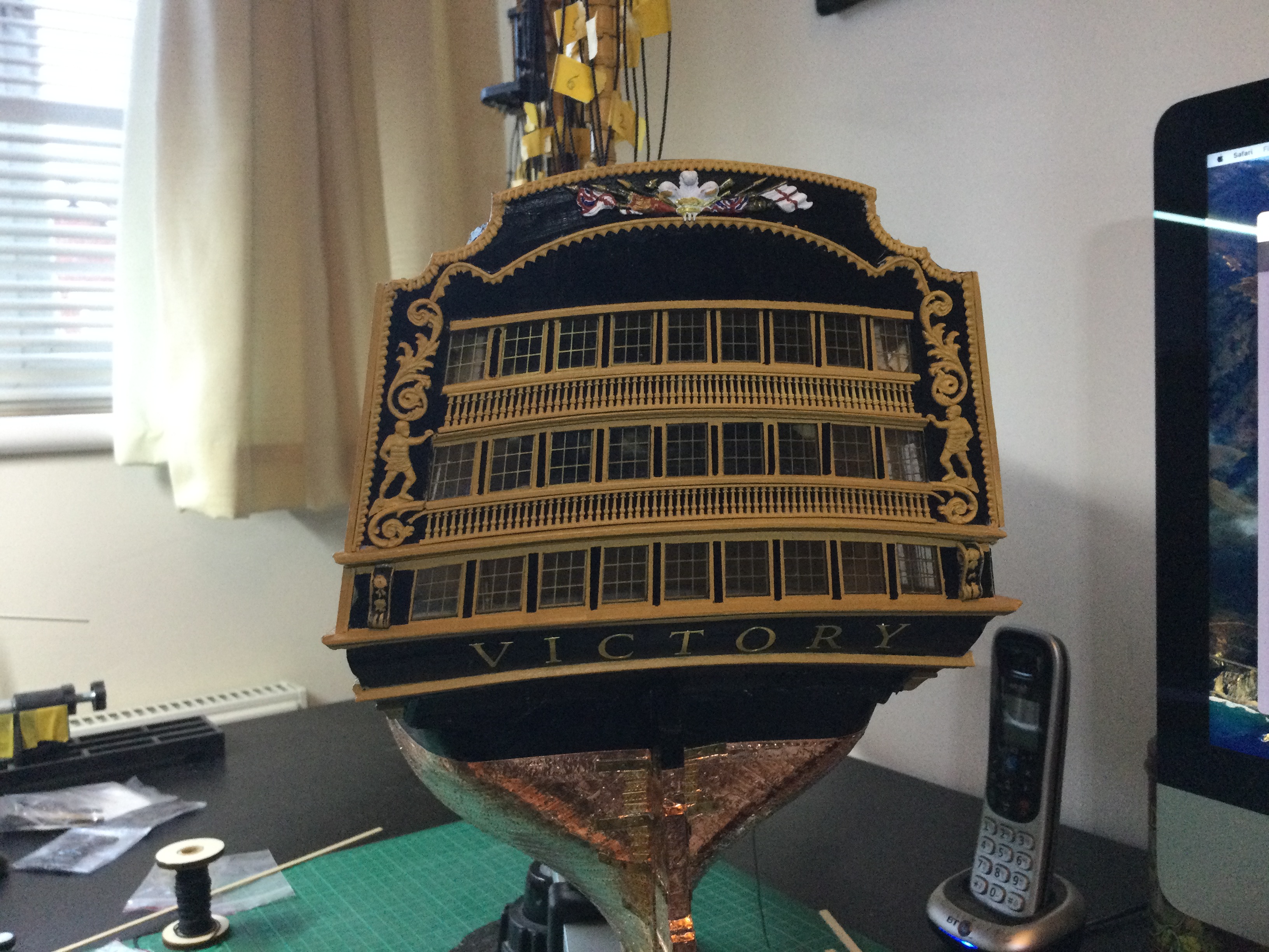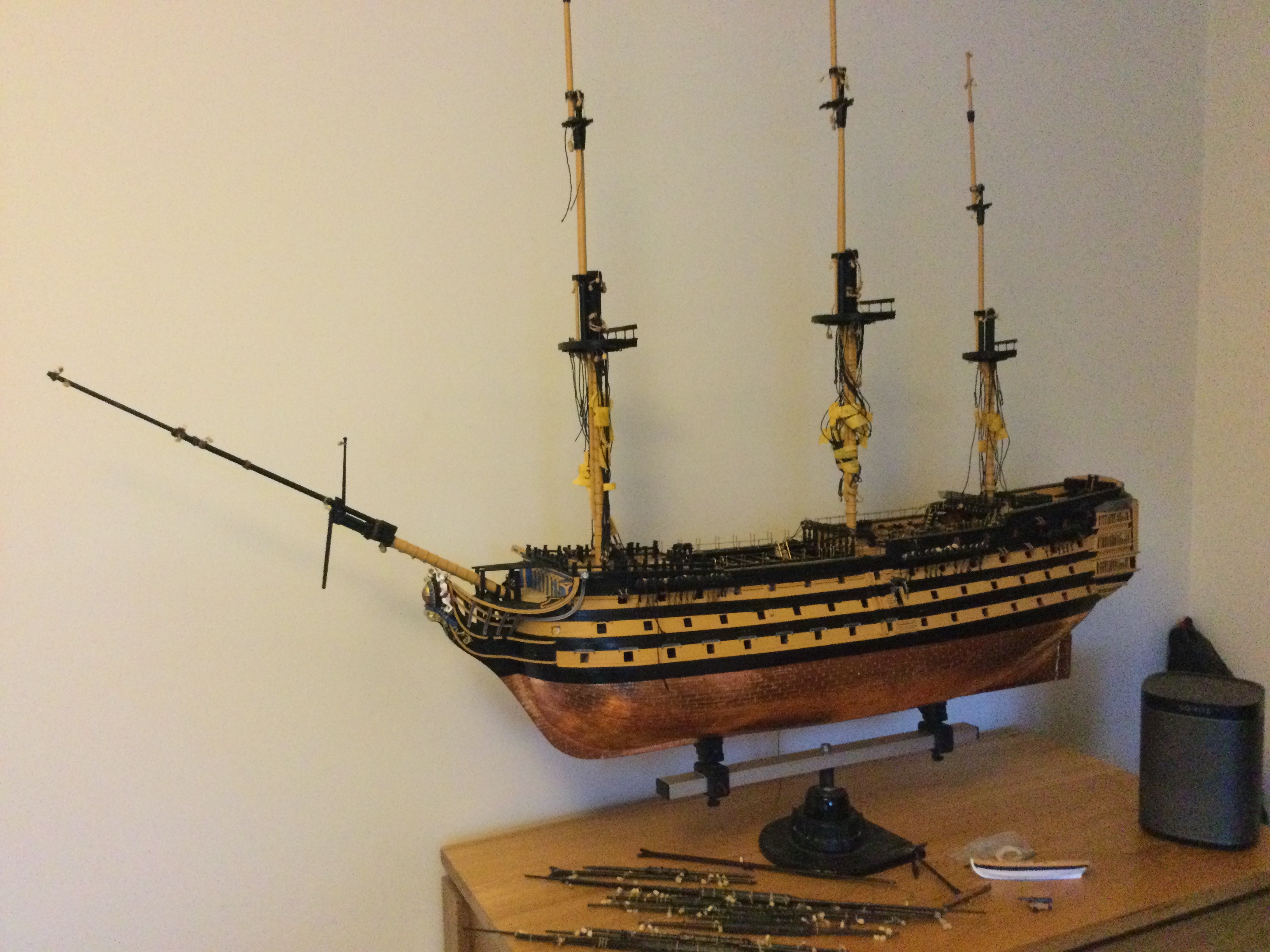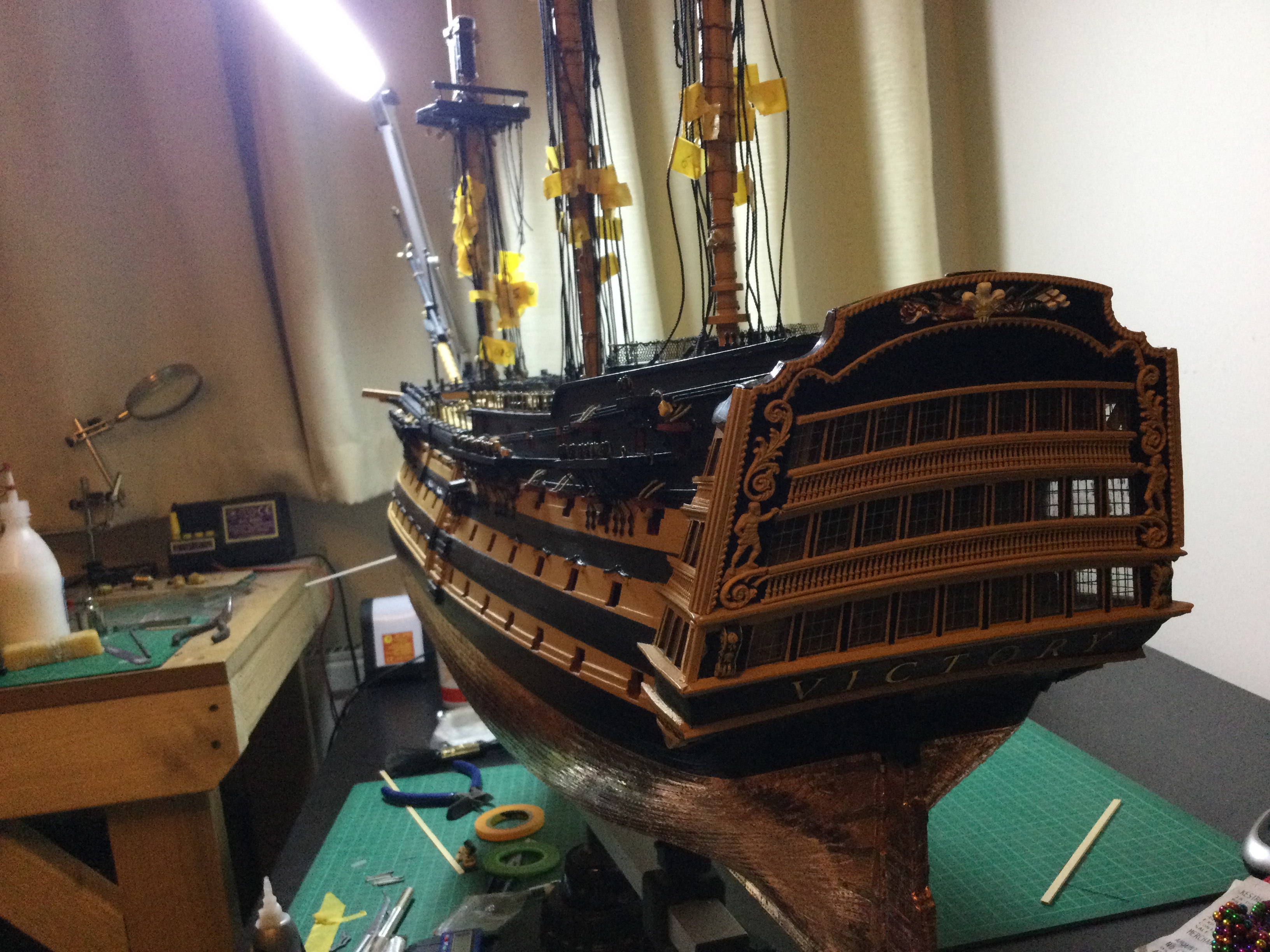HI just thought I would say hi and post a few pics of my build, it has been a while I started in 2010 and put a couple of years of evenings and weekends into her and got as far as issue 72 and there she sat as life events got in the way, anyhow I have been on furlough for last 10 weeks so decided to dust her off and start again, I had to create a new space and get a workbench dig out all the tools work out where I was, that itself took a weekend up. So here I am several weeks and a few hundred hours of work later and I have turned her from her stained look I was originally going to just do the stained version, to her new painted look with the copper hull using the copper tape method.
