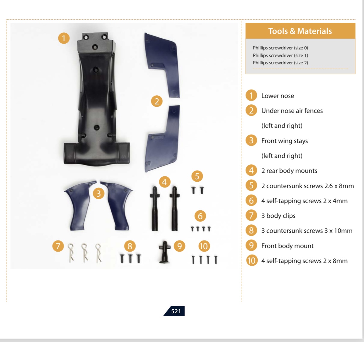 Attaching a photo of the lower nose, the under nose fences and front wing stays. I have the front racing wing already. Thanks in advance!