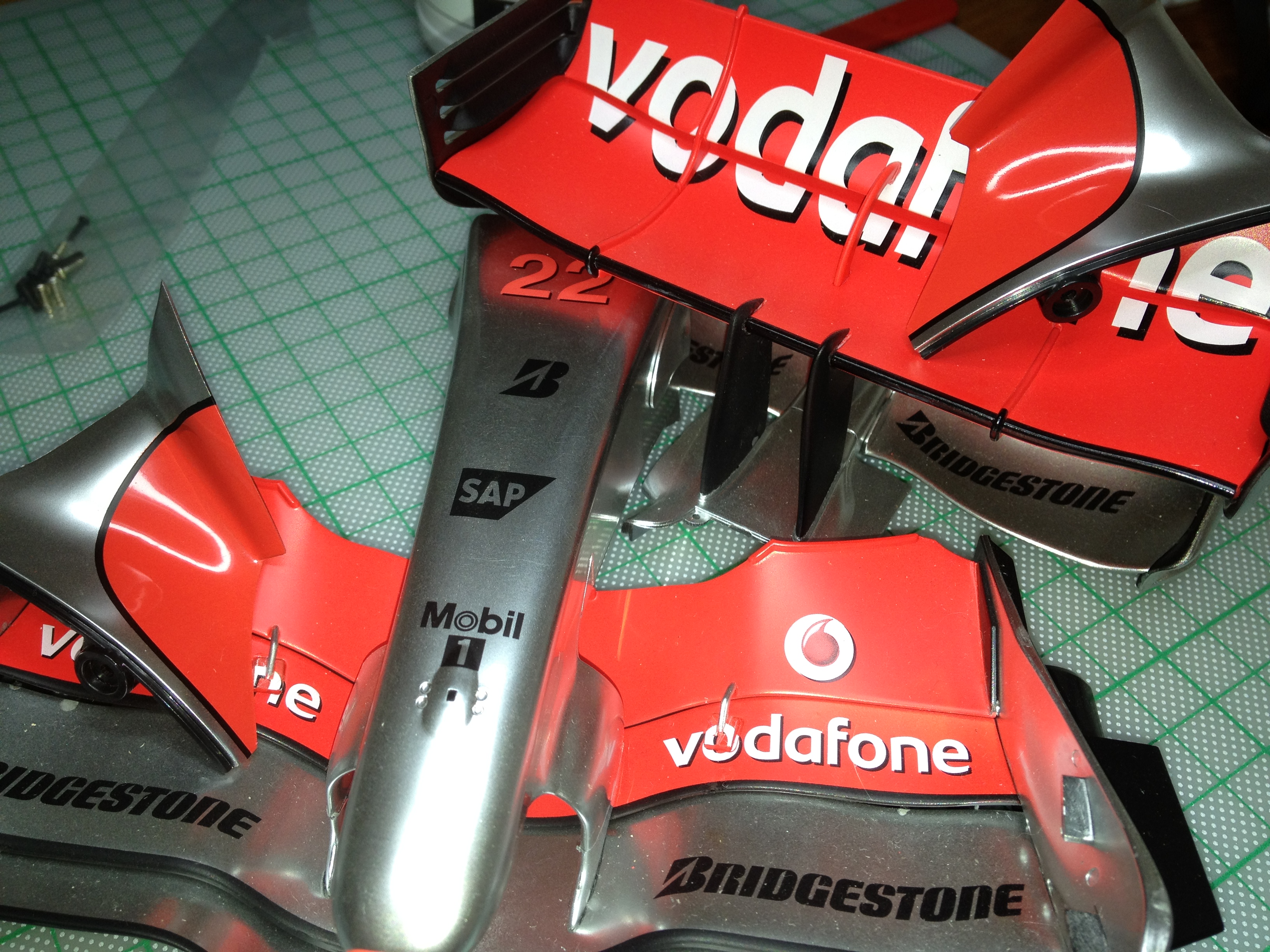 I have a canvas of the MP4-22 on my wall and there is slight colour difference between front wing and nose cone decals,so it maybe correct Builds in Progress