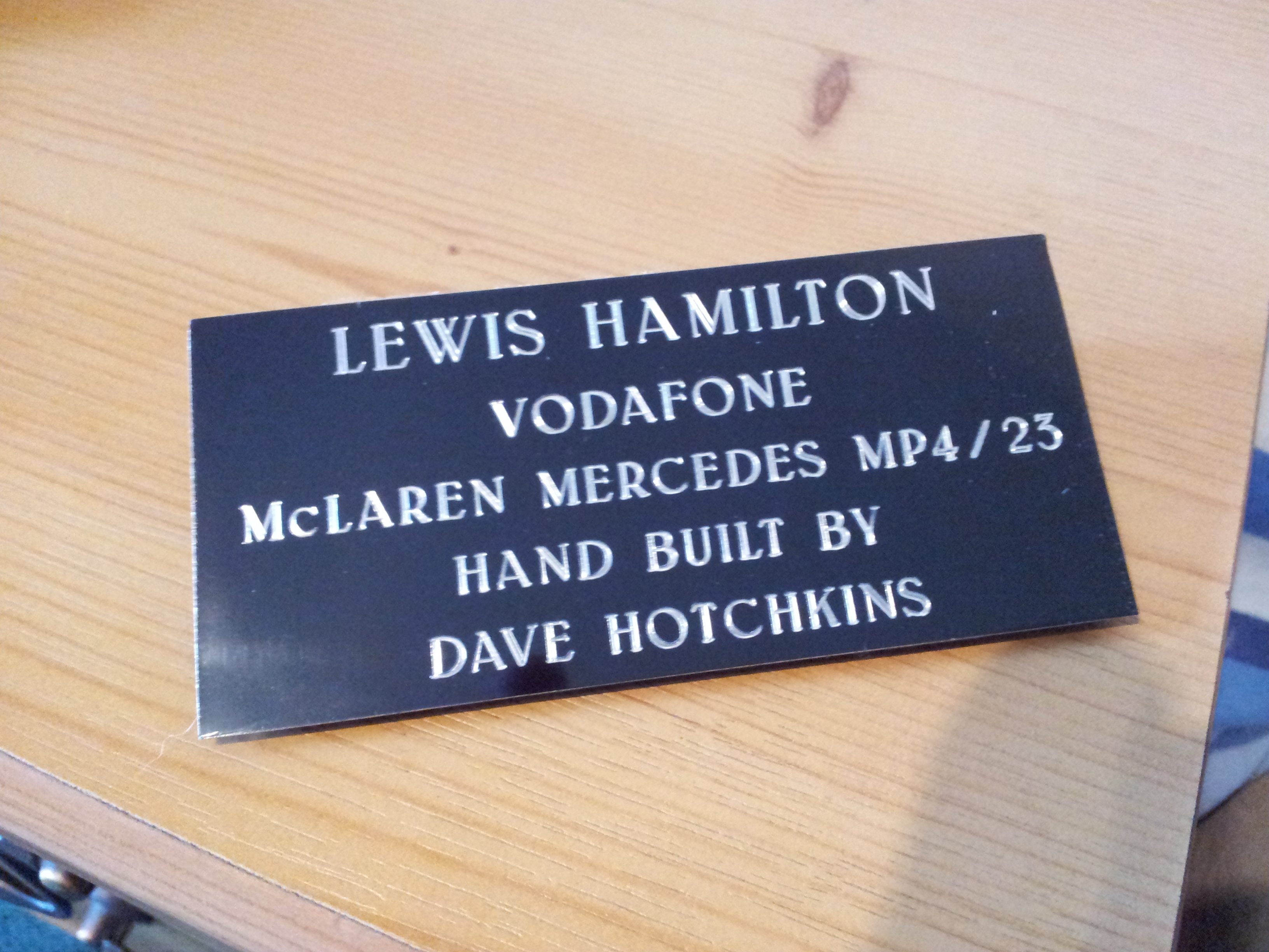 i found on ebay a plaque with the drivers name and model of the car and at the end it says hand built by, and then you have your name engraved!! nice little touch when its in a display case :-) its about 13 pounds from memory.