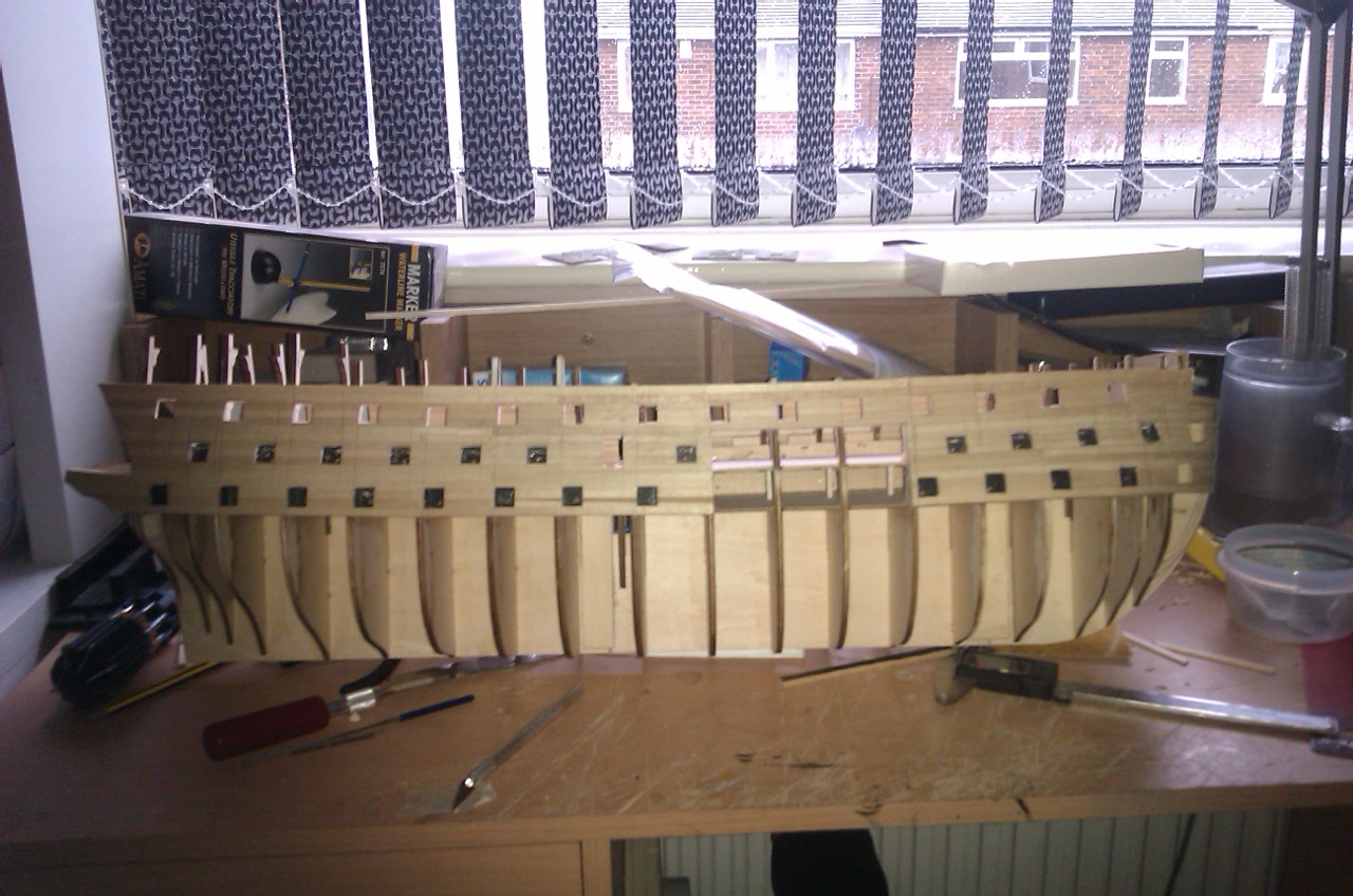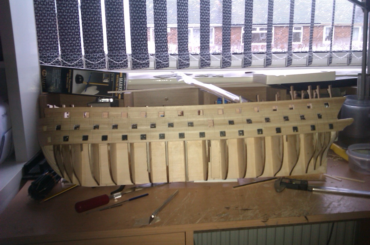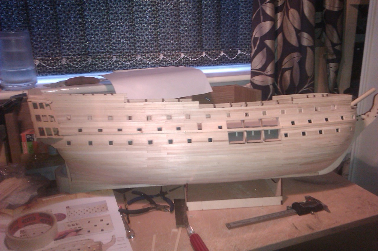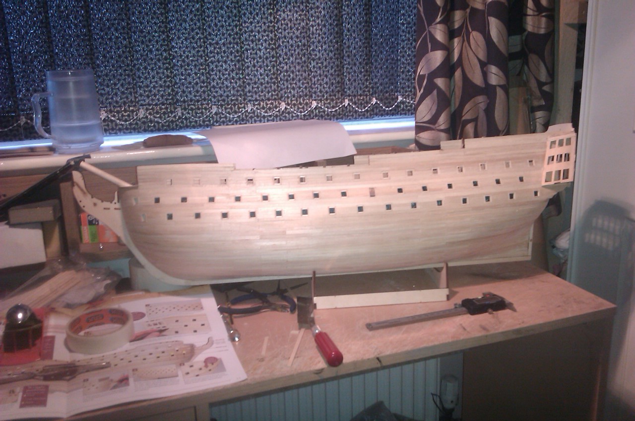 heres up to issue 25 just got the front to trim & the gun ports to cut in the rear work is starting to get in the way of the build now lol