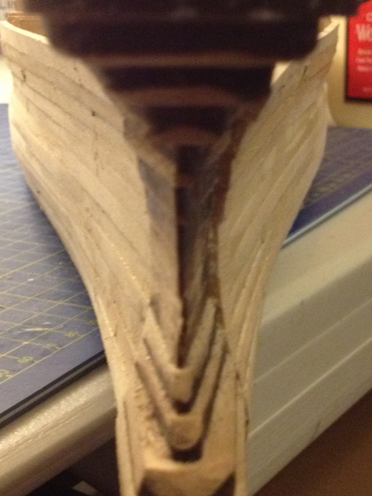 it looks like the centre section of the assembled bow is off line[centre 5 pieces]or has been assembled the wrong way up,its easily done as they all look the same untill assembled.I built my bow on the hull to keep it aligned.