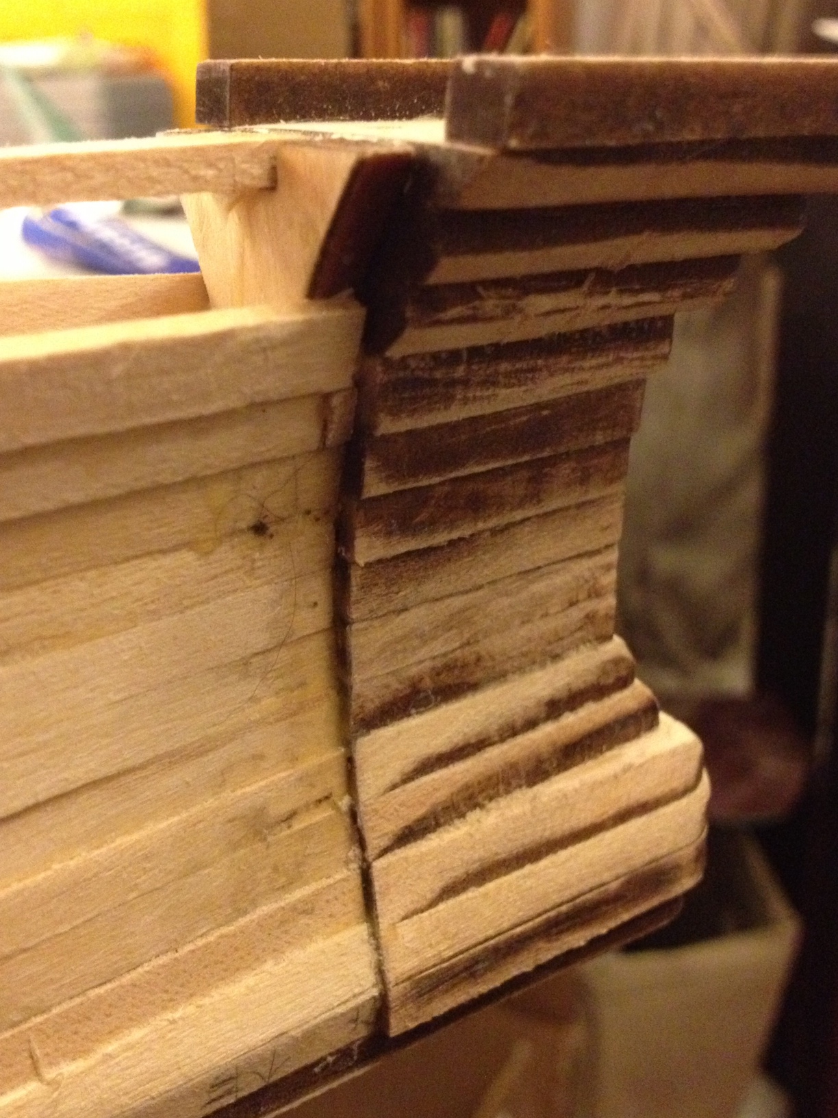 I need some advice. I am building the Bridge Ladders and the strakes. While executing steps 38 to 50 I have noticed that towards the middle and top the there is a gap between the strake and the bow. On one side the strake is wider than the bow and on the other side it is the opposite. The bow is centered on the bottom and looking at the individual components on the bow they do not appear to be misaligned. No matter how would you recommend fixing this. I can sand down the extra width on from the bow on one side but I am loath to sand the strakes on the other side to align with the bow. Should I use a filler of some sort, if so what. Any help would be greatly appreciated. This is the first time I have run into this problem. I have include 2 pictures to illustrate the problem. Looking directly at the first on you can see how the strakes are wider than the bow. The second one show how the bow is wider than the strakes. I know its not as neat as yours but this is only my 4th wood model. All your help is appreciated.