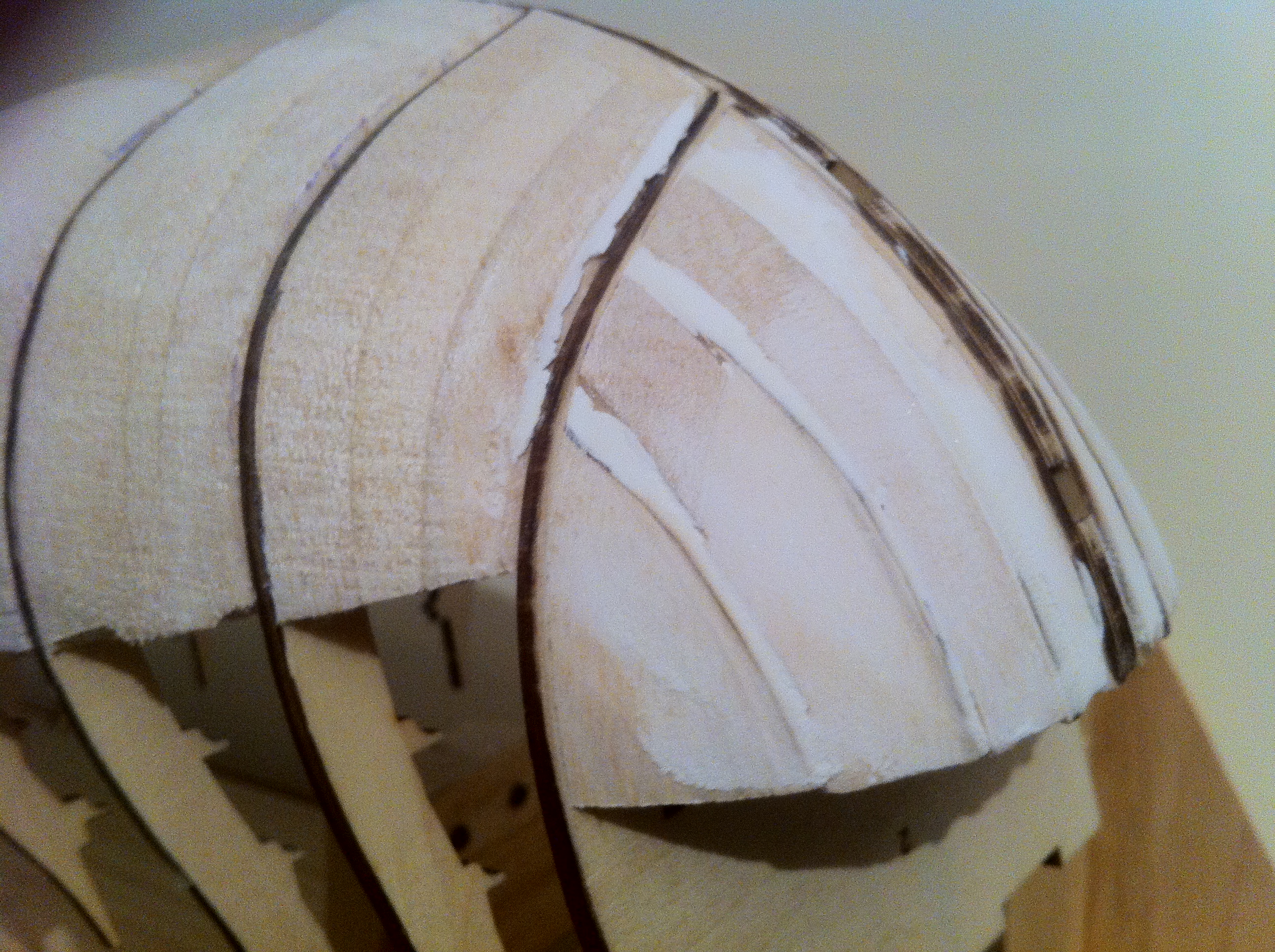 Gandale wrote:Delboy, you are almost there...don't take any more of the front. You are taking it down to give you a smooth flowing surface across all of the ribs... take a look at my build post 117 and you should see what I am referring to.... the bow is quite bulbous as you will see... If you are still unsure then wait for Mr T's official build and the mag instructions to explain how to complete the task of fairing the hull....