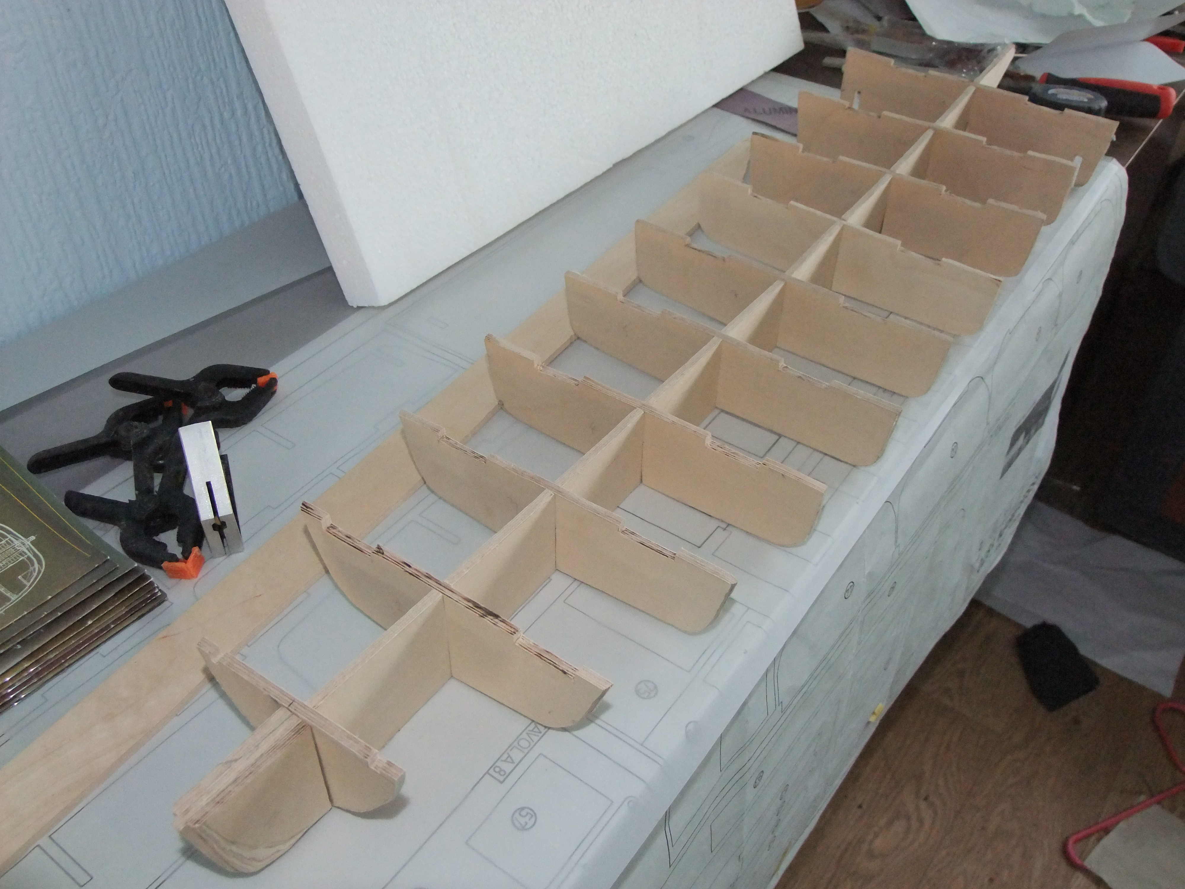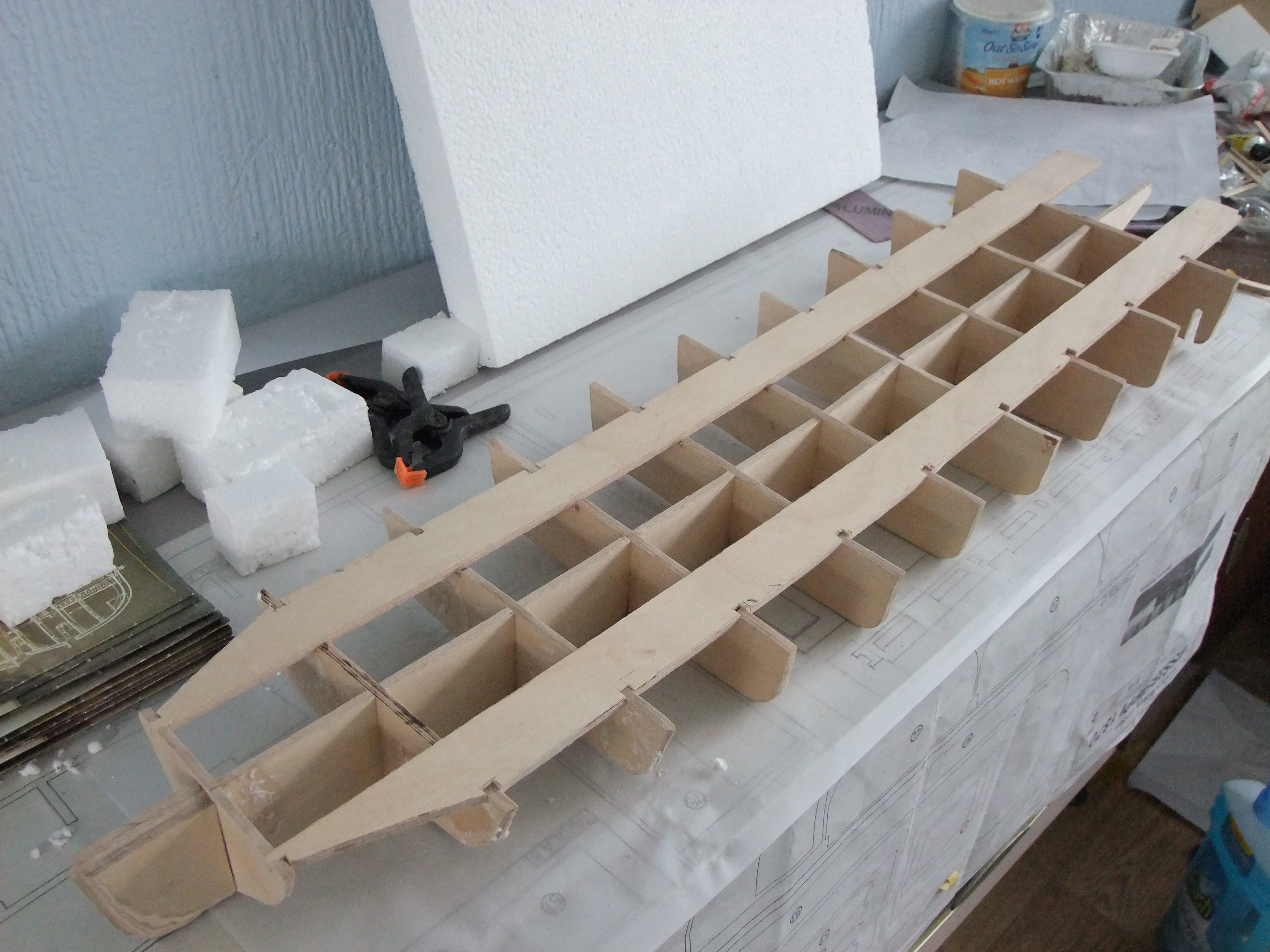 Progress has been made, and providing I can make Karl's instructions work, with photos too. The rest of the frames have been made and fitted, plus the two longitudinal reinforcements. The supports for the paddle wheel have been fitted, these will be planked as a continuation of the main hull. The keel has been made and installed. I am now awaiting delivery of a block of balsa, to fill in the first three frames. There are some possibly awkward curves between frames one and two. I wish I had thought of balsa, when I did Victory's bow. I faffed around with templates, and I am still not sure I got it dead right. My outstanding order of wood strip should arrive later next week, so I may be able to make a start on planking the hull.