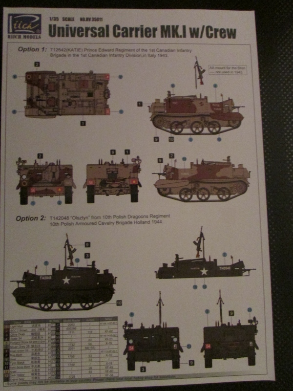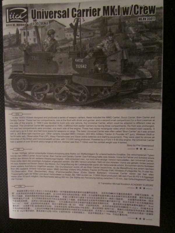 Riich were a name I was only familiar with through magazine articles, mostly favourable, however when I heard about their release of a Bren Gun Carrier in 1/35 scale I just had to have one! The kit is moulded in light grey styrene and supplied on 12 sprues with the addition of 1 clear sprue. 3 etched frets, 32 springs, 8 rods, a length of chain & cord & two decal sheets! As this is a fairly small vehicle you can imagine the detail included out of the box. Please see below for some pics of the parts, I've left them in bags as I won't get a chance to build it for a while. File Attachment(s): Wilfy the Sea Dog attached the following image(s):